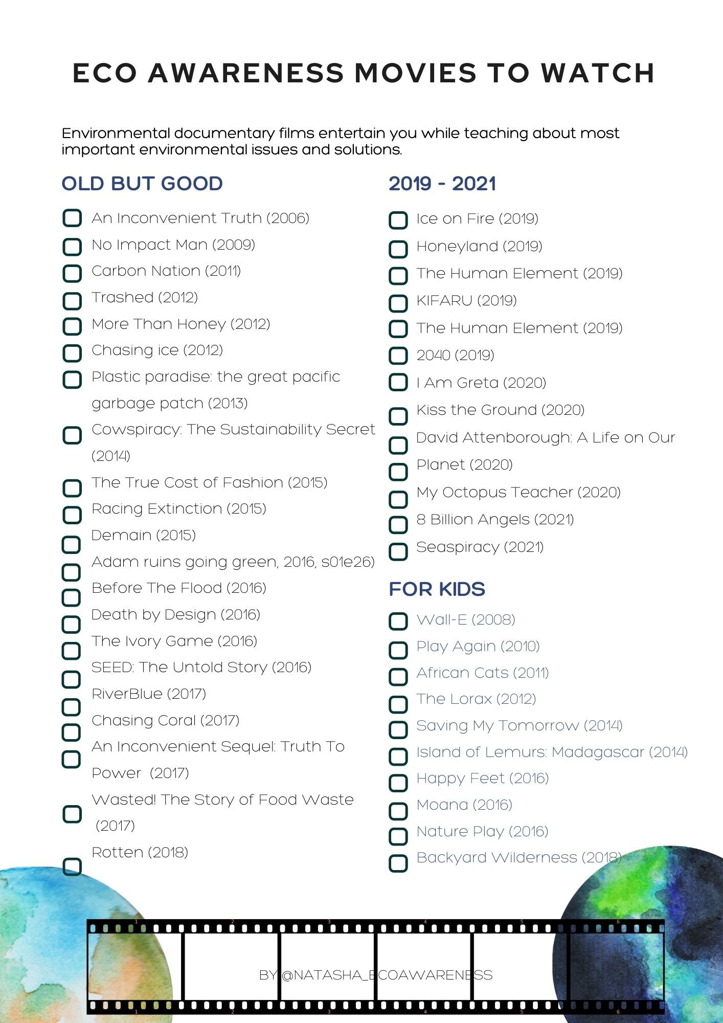 ✅44 documentaries regarding various topics like climate change, non impact living (zero waste lifestyle), abour ocean and wild animals.