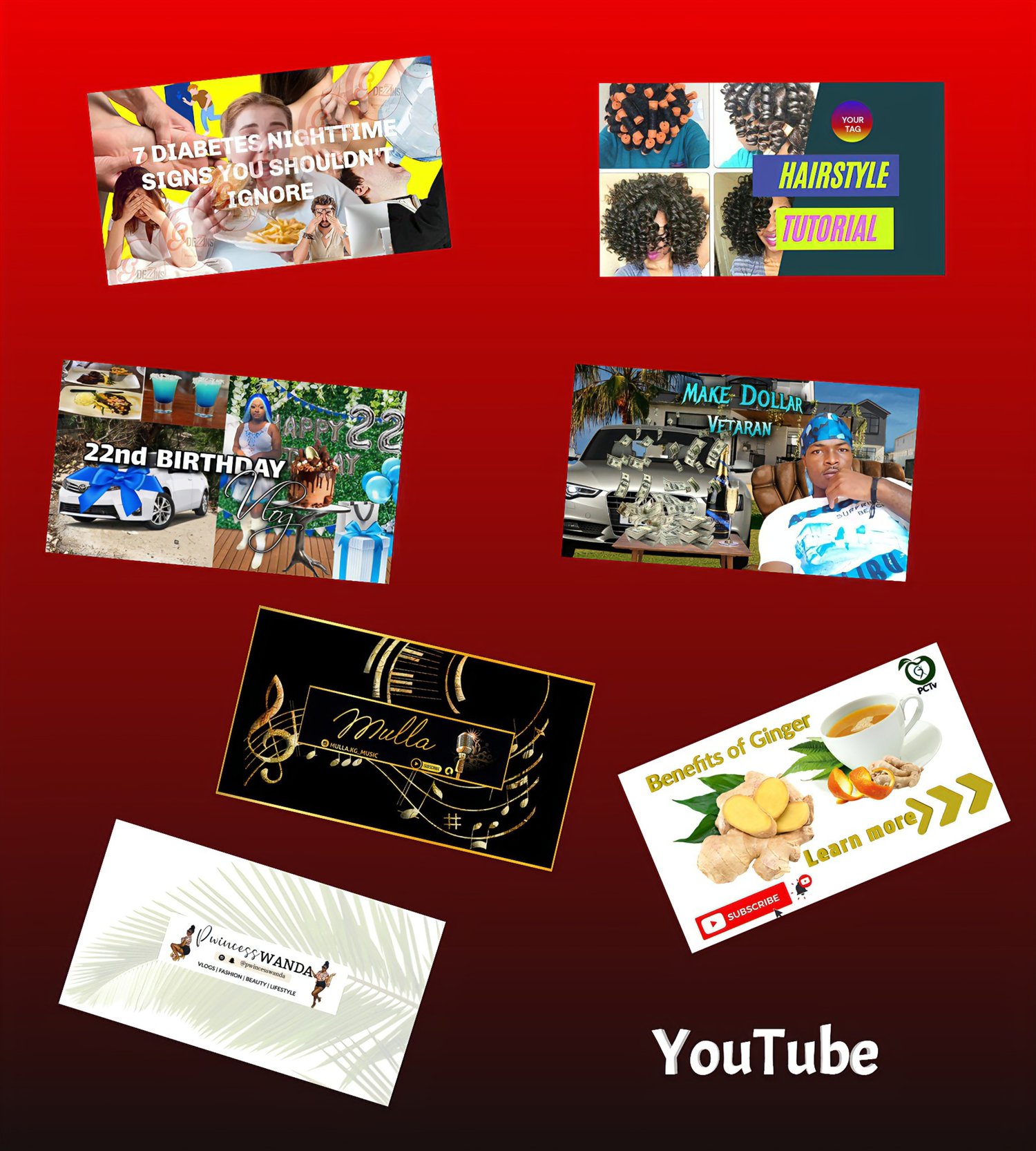 YouTube Covers & Thumbnails. Indicate whether it's cover or thumbnail in the order form. From designing your channel cover photo to your content thumbnail: be it music video, vlog or any other content. Customize your own design by request only. Prices will be according to your request.