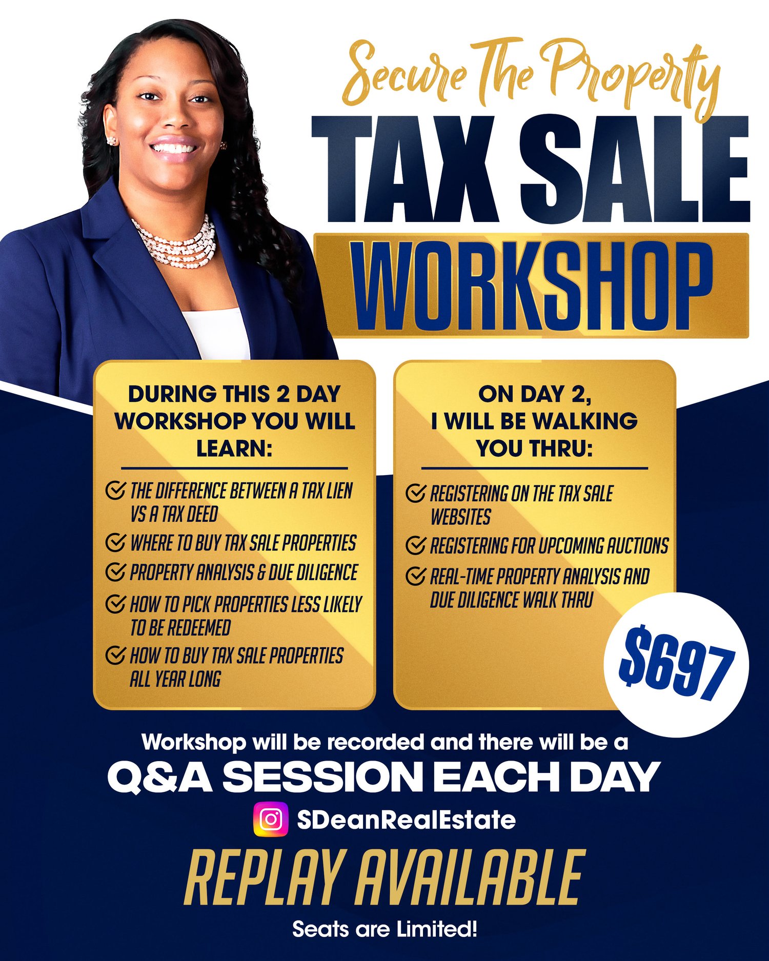 You will have immediate access to the 2 Day Tax Sale Workshop Replay. Come prepared to learn, ask questions in the group and be ready to take action. It's time to secure a property!