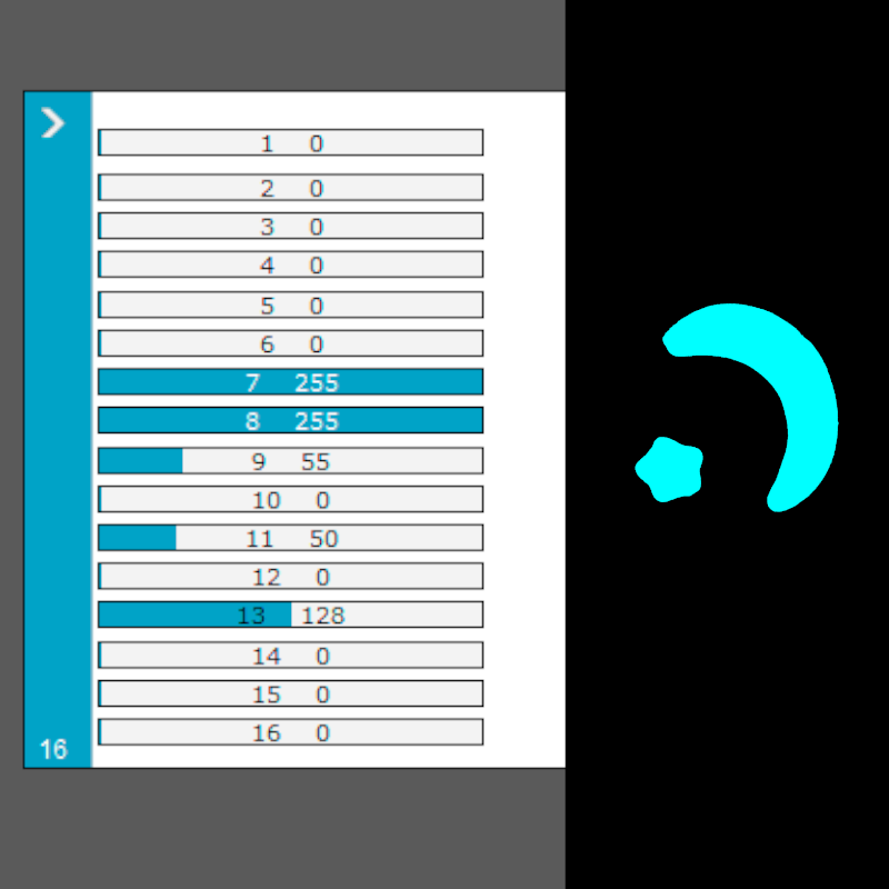 * Verifique que coincidan estos canales: 8 Dimmer, 7 Strobo/Shutter, 9 en el valor 55 = Celeste, 11 en el valor 50 = Gobo de Luna con estrella, 13 foco (ver tercer foto).