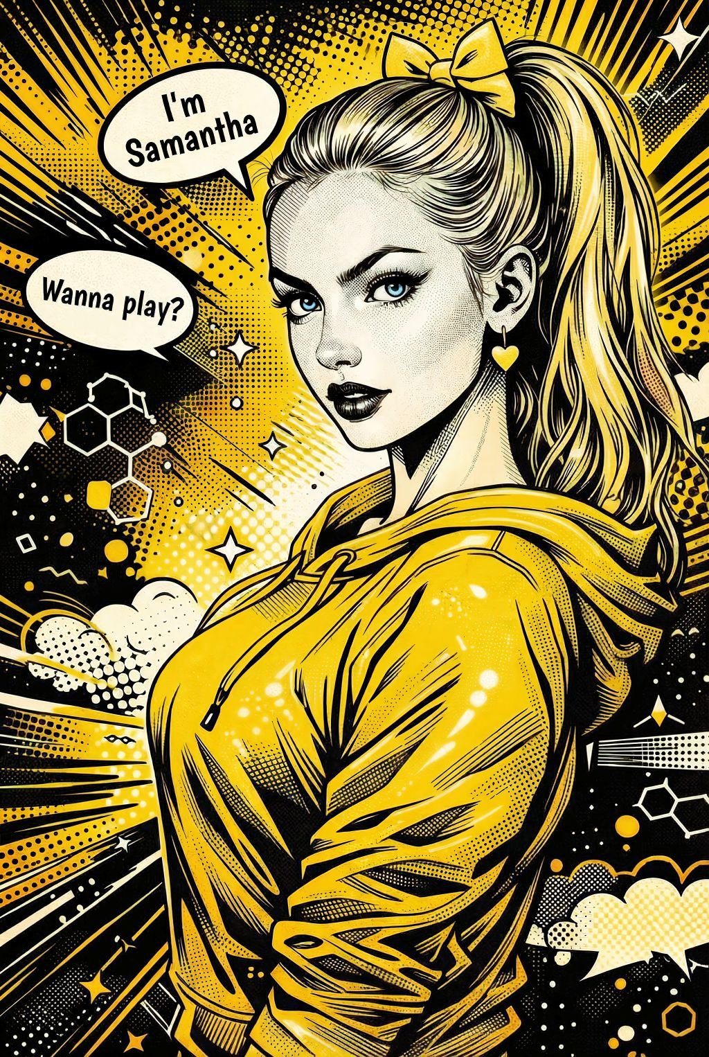 This ultra-high-res artwork fuses retro pop-art energy with modern, flirt-forward attitude: punchy halftone textures, dramatic ink lines, and a blast of yellow that screams main character. The speech bubbles don’t just talk—they challenge. “I’m Samantha.” (As if you could miss her.) “Wanna play?” (As if you could say no.)