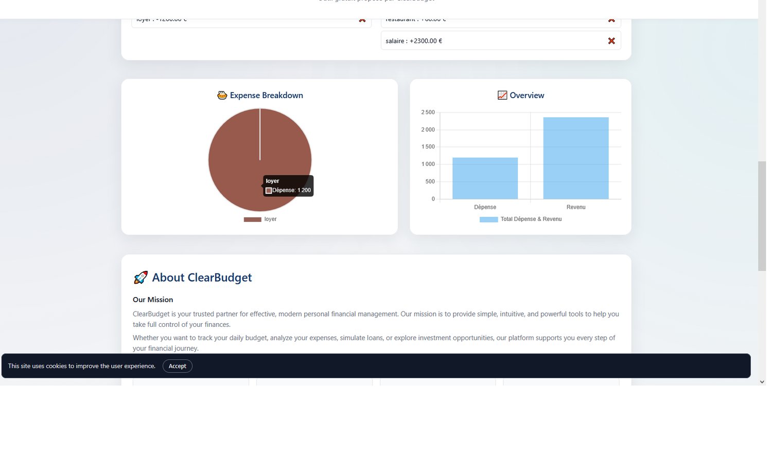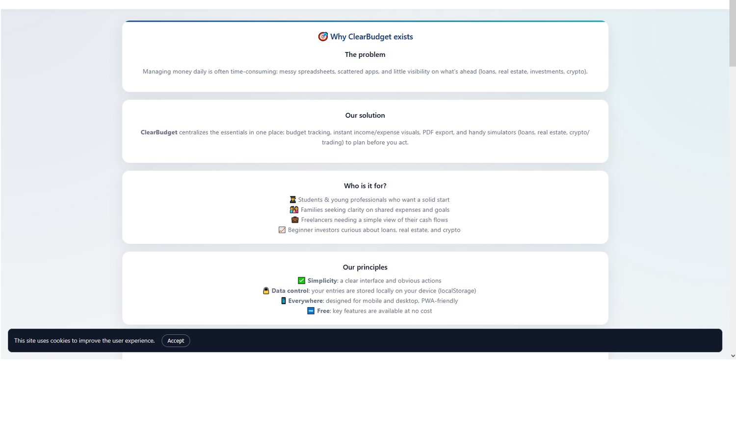 ClearBudget est un template moderne en HTML / CSS / JavaScript pour créer rapidement une application de gestion de budget avec graphes interactifs, historique des opérations, export PDF, et stockage 100% en local (localStorage).