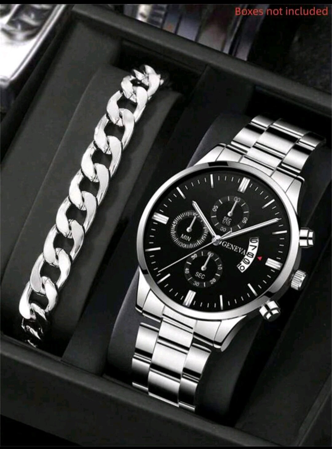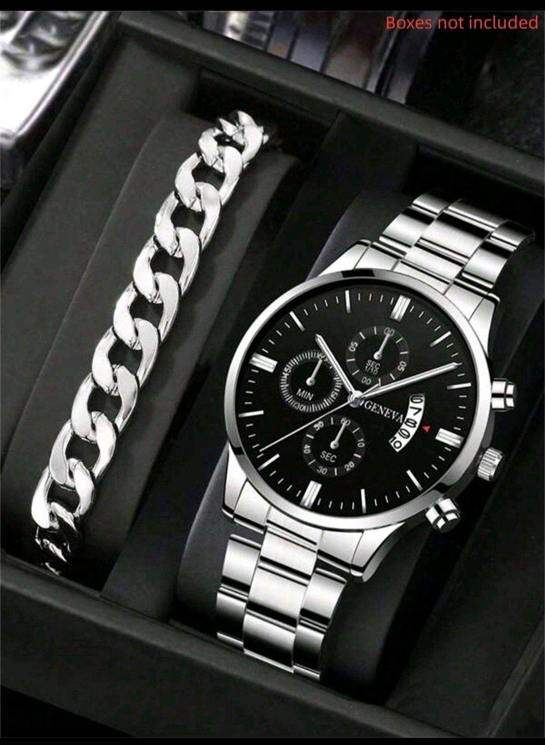 1pc Men Silver Zinc Alloy Strap Business Calendar Round Dial Quartz Watch & 1pc Chain Bracelet, For Daily Decoration
