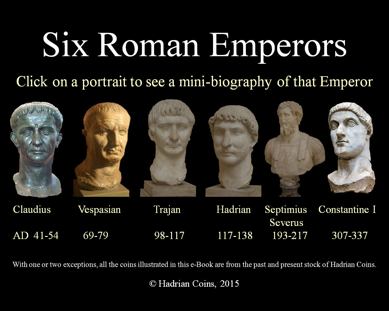 Mini illustrated biographies of six iconic Roman Emperors, each of whom played a significant role in the story of Roman Britain. The six are Claudius, Vespasian, Trajan, Hadrian, Septimius Severus and Constantine I.