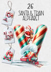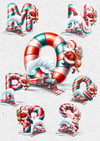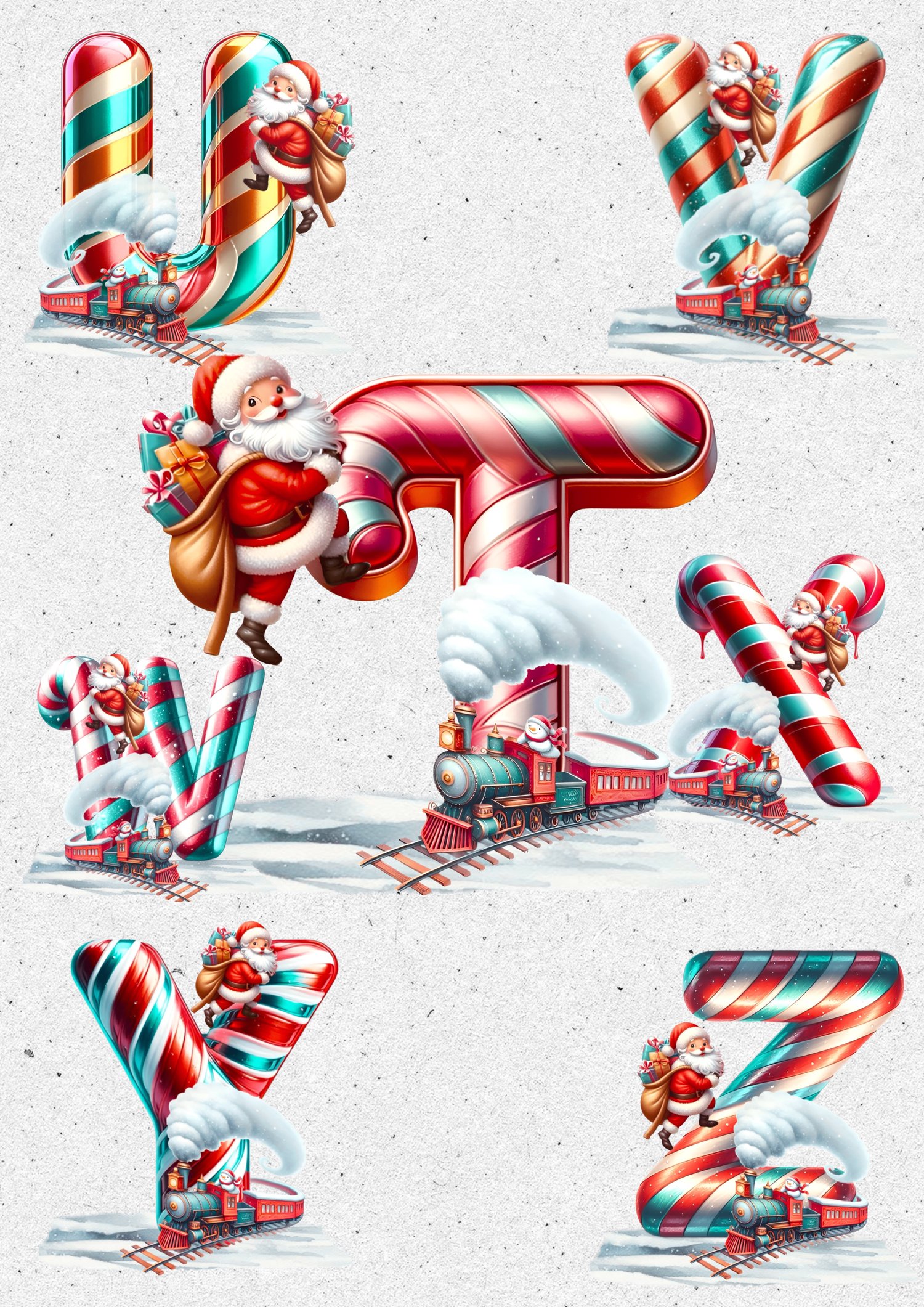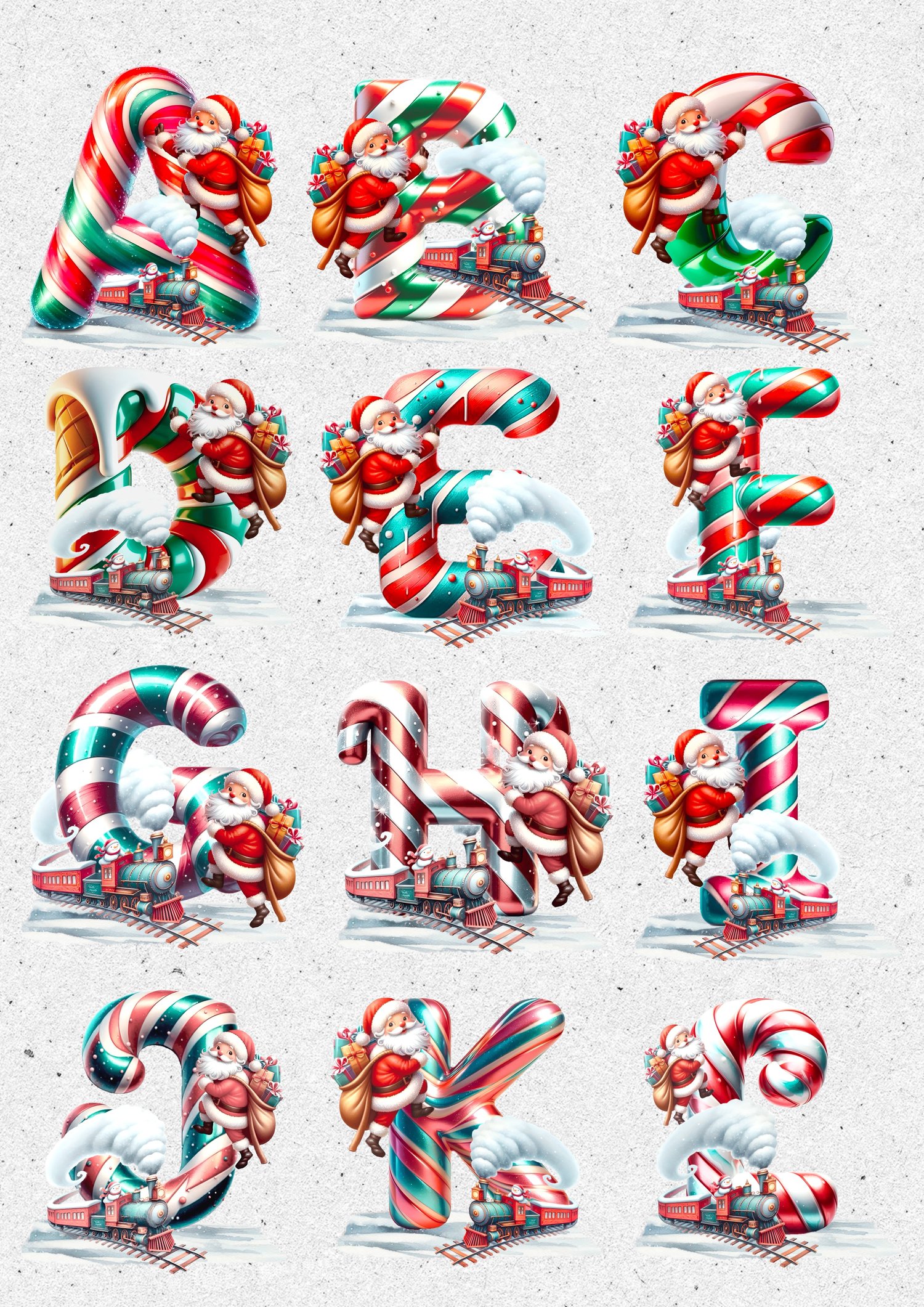 🌟 3D Christmas alphabet. Candy cane letters with climbing Santa and express train. 26 PNGs. Sublimation or print.