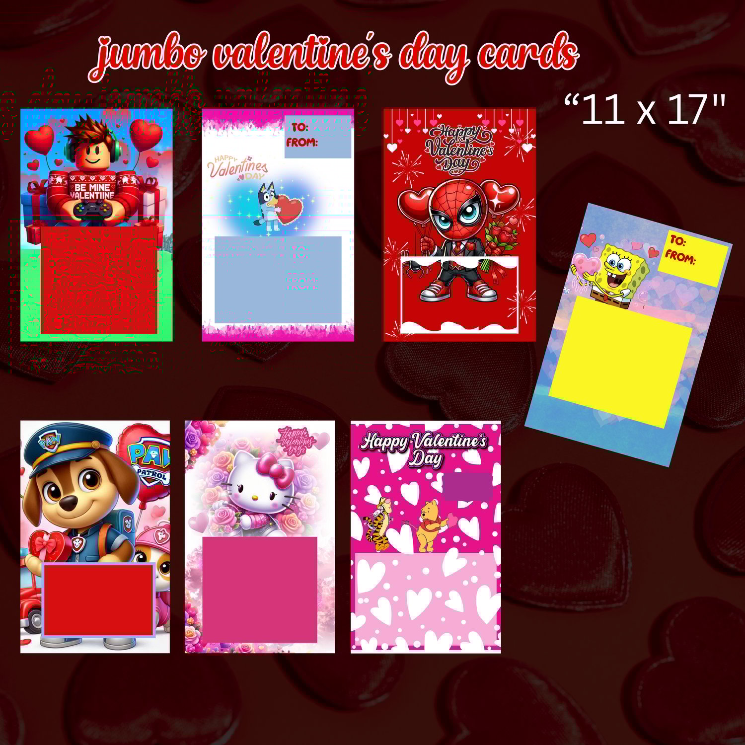 it comes with 7 different designs that you can edit. these eye catching 11x17 inch cards are perfect for classroom exchanges.