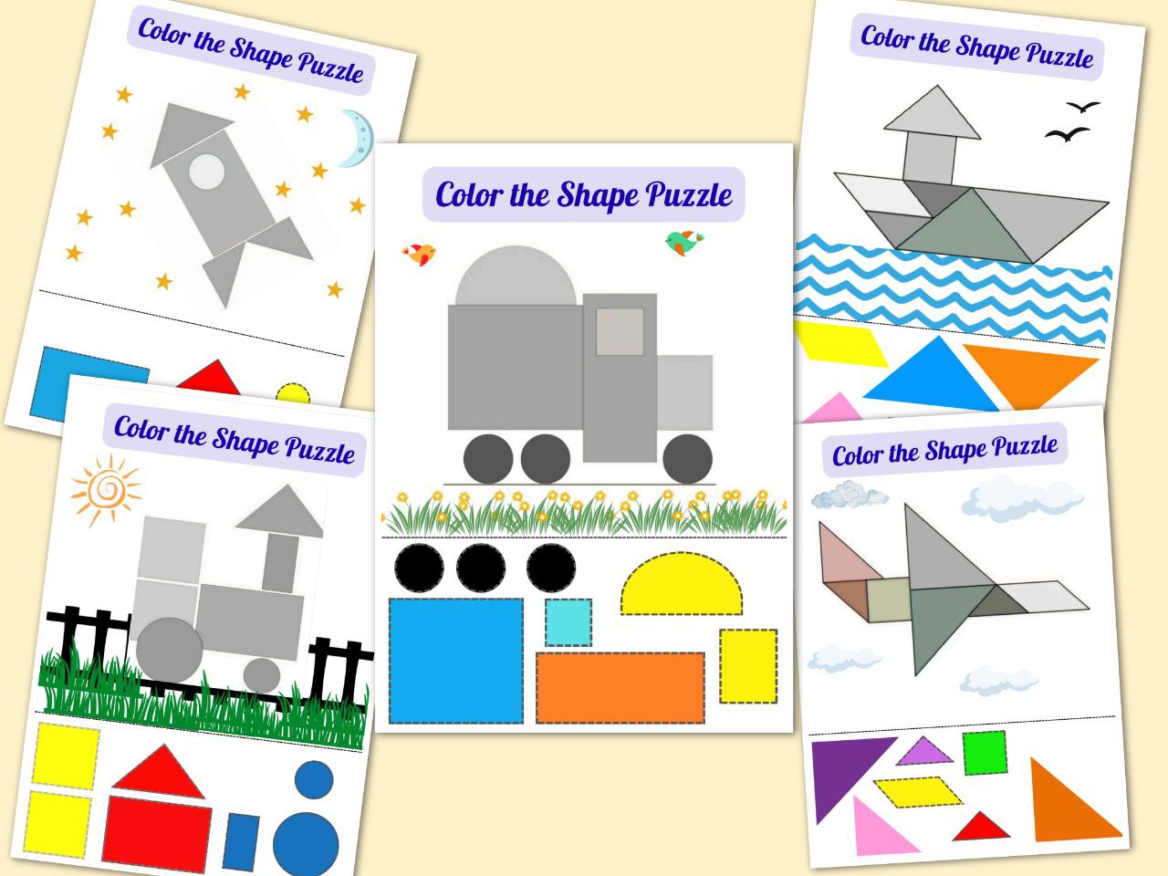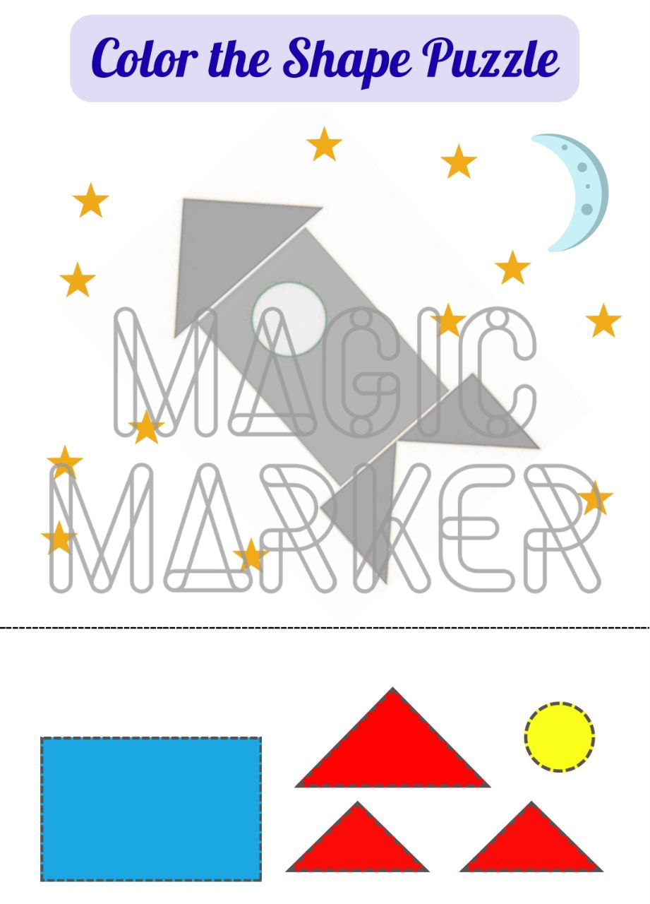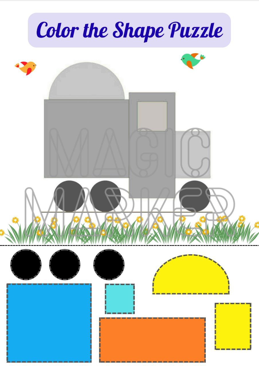 "Color the Shape Puzzle" is a fun and hands-on activity that helps children improve shape recognition, color matching, and fine motor skills. Kids are given a grey object made of geometric shapes. Their task is to cut out colorful shapes and glue them in the correct places to recreate the picture.