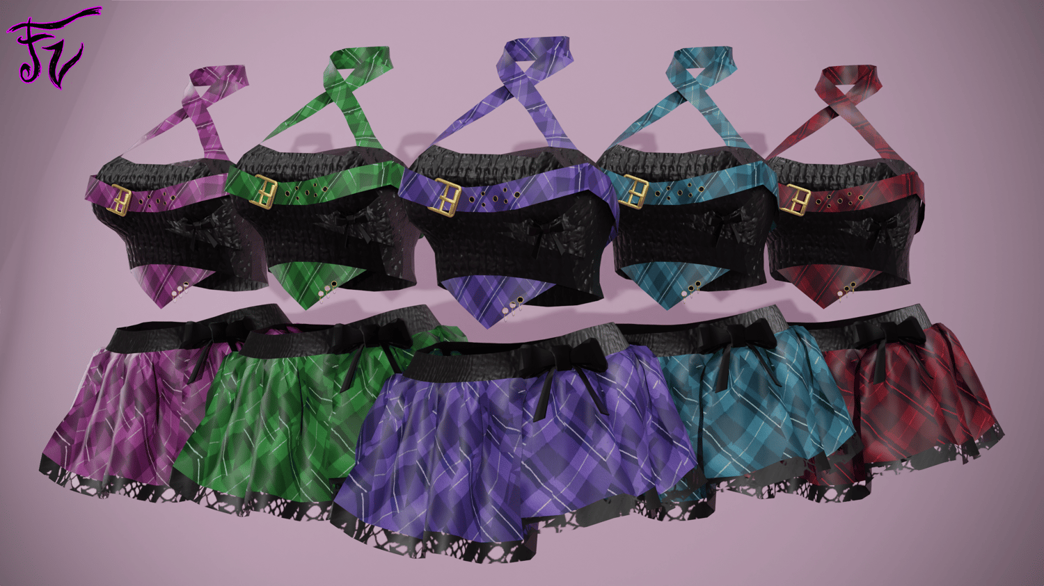 Punk-inspired outfit with a purple plaid mini skirt and matching top, featuring black accents, gold buckle details, and distressed textures for a bold rebellious look! ❤