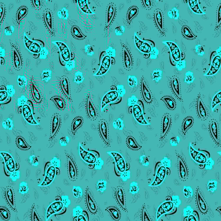 Vibrant paisley in teal and mustard on black.