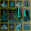 Soaring spires, ceremonial palaces, and towering civic landmarks dominate this set, embodying the cultural pride and technological mastery of the civilization. The cool teal palette is accented with gold and white, emphasizing grandeur, precision, and an enduring architectural legacy.