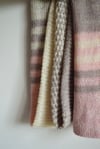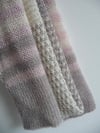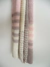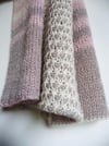 A good stash busting option, this is a multi textured partially double knit scarf with stripes and slipped stitches thrown in for good measure.