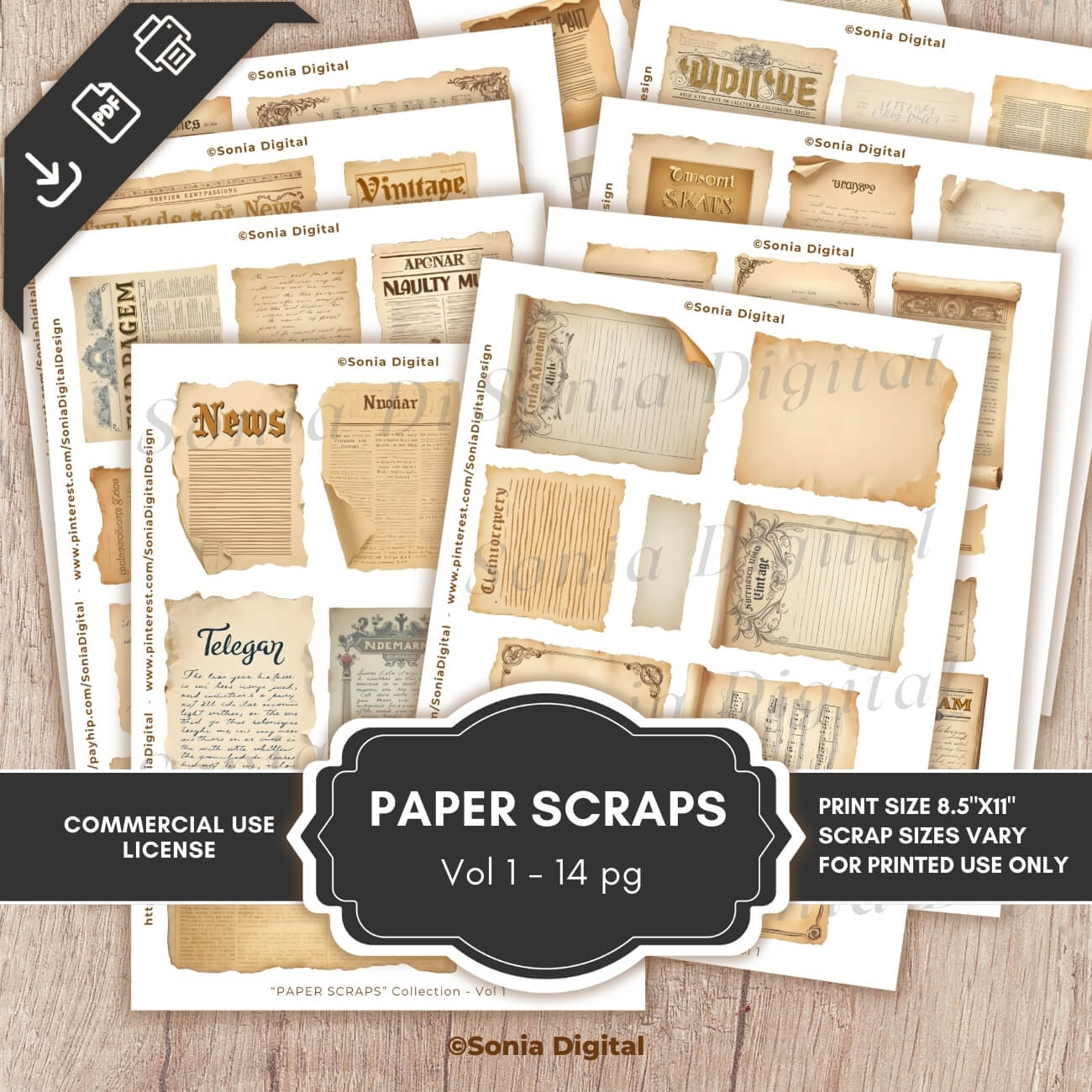 14 printable pages containing Fussy Cuts, "Paper Scraps" Collection (Vol 1), for Scrapbooking and Junk Journal creations. Pages are Letter sized (8.5”x11”). Commercial use license included*.
