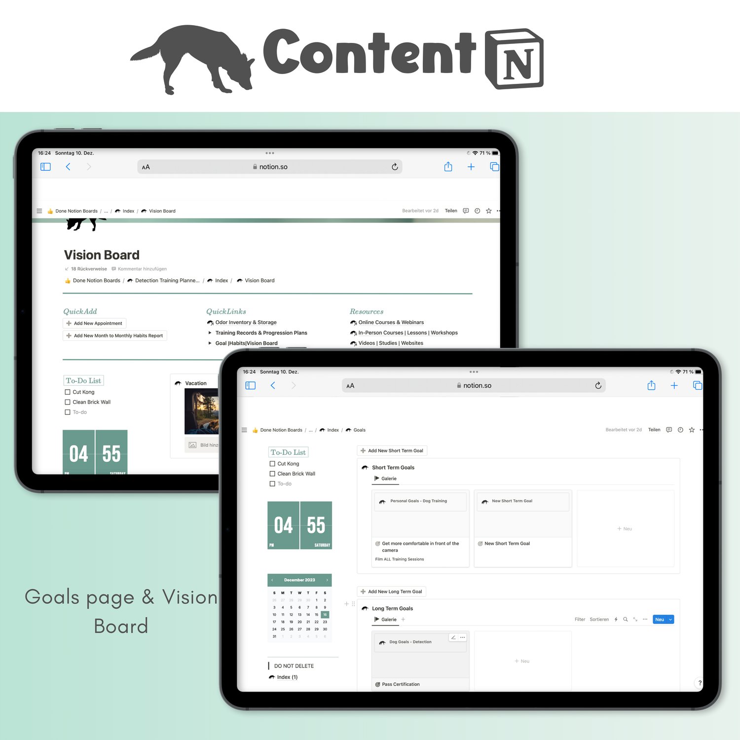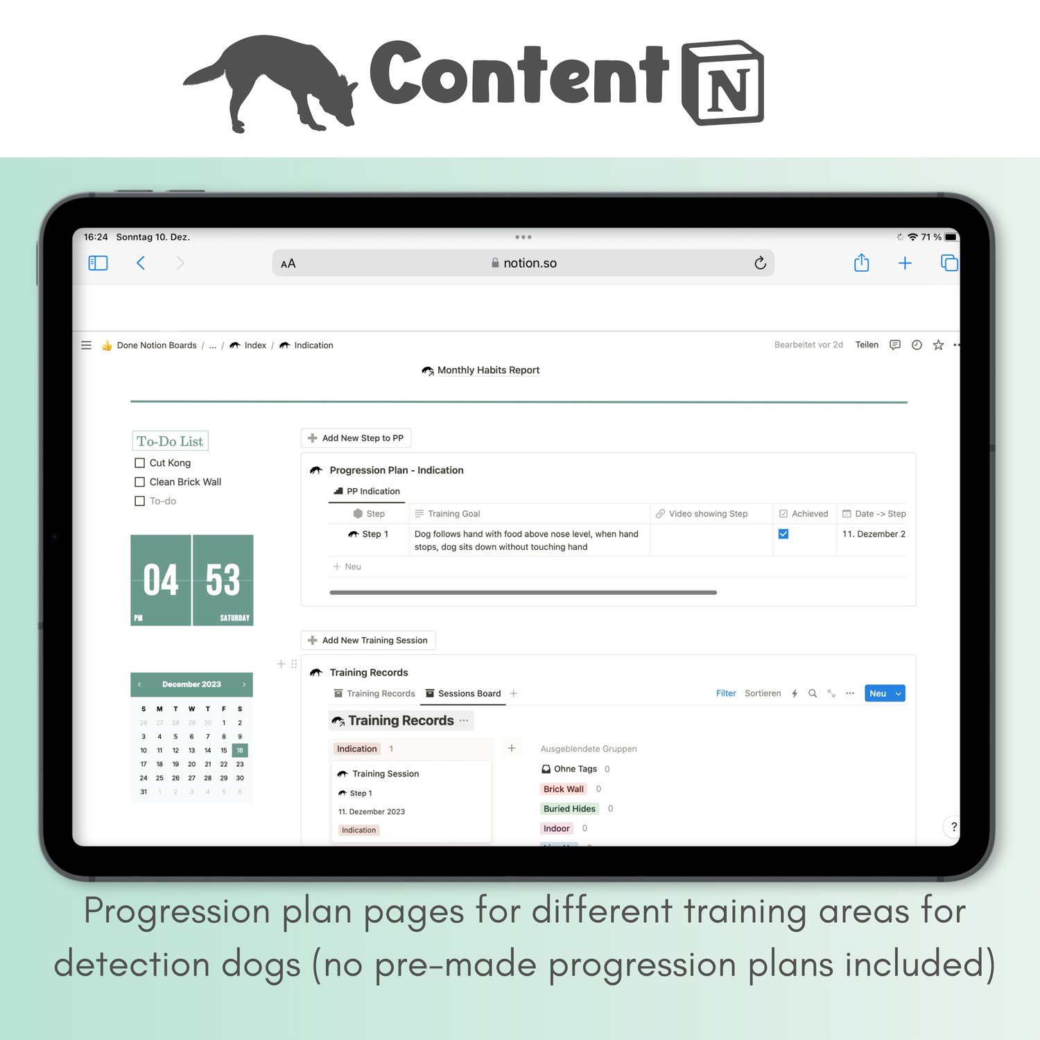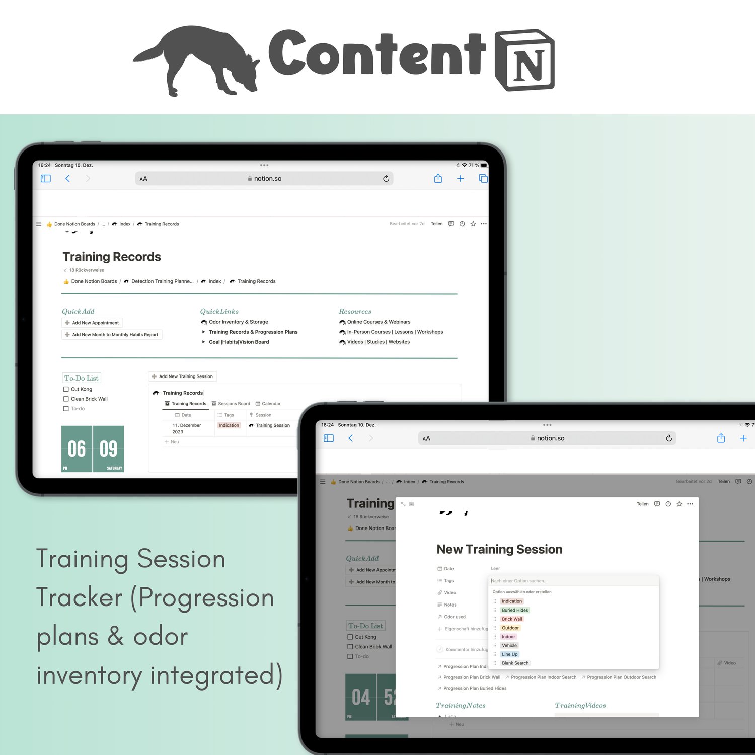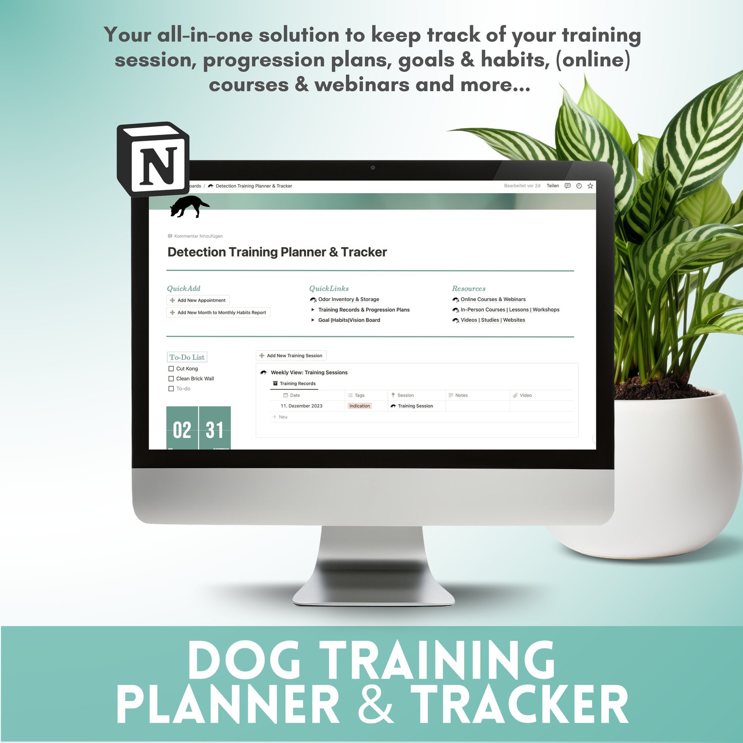 This digital Notion-based planning and tracking tool helps you stay on top of your entire training process – from training sessions and progression plans to odor tracking, courses, client info, and goals.