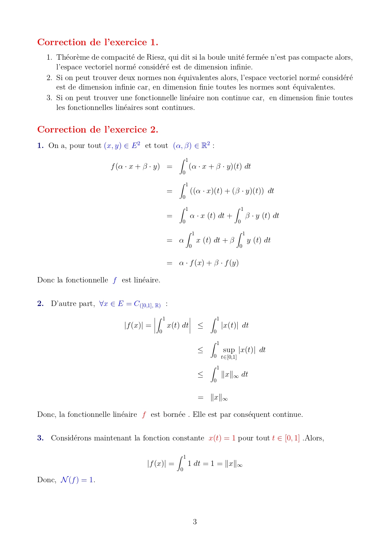 - Fonctionnelles linéaires continues : Montrer qu’une fonction f est linéaire et continue, et calculer sa norme.
