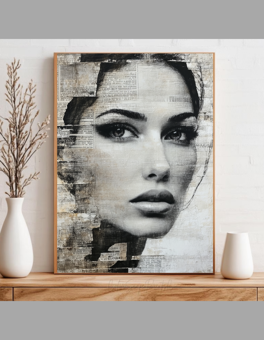 This captivating mixed-media collage blends modern art with classic portraiture. A striking portrait of a woman is layered over a backdrop of vintage newspaper clippings and textured surfaces. The piece features a monochromatic palette of black, white, and gray, with a bold splash of bright yellow for contrast. This unique wall art print is perfect for adding a touch of sophistication and intrigue to any contemporary living space, office, or gallery wall.
