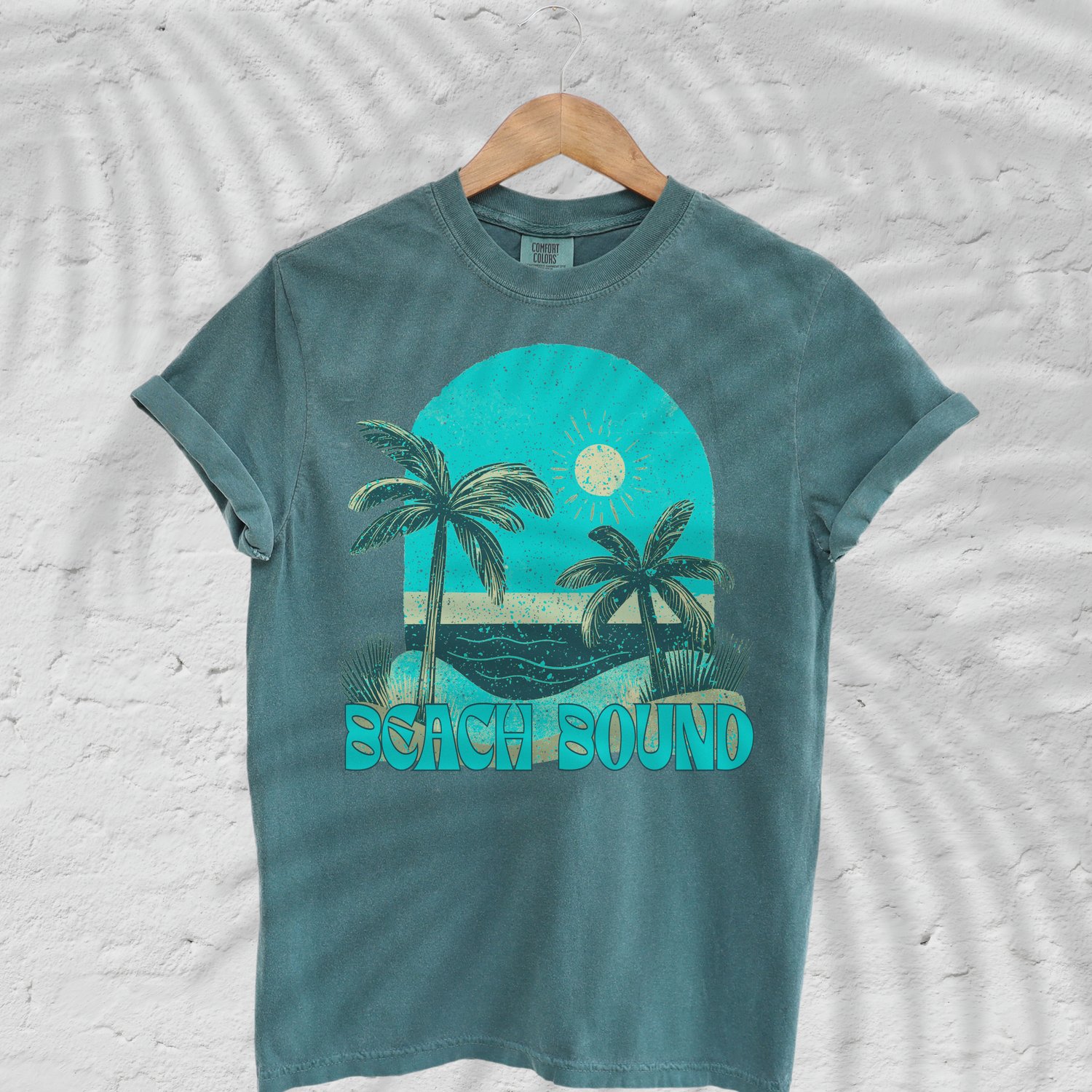 Retro Beach Shirt Mockup | Palm Tree Ocean Sunset Tee | Coastal Summer Graphic Design PNG