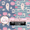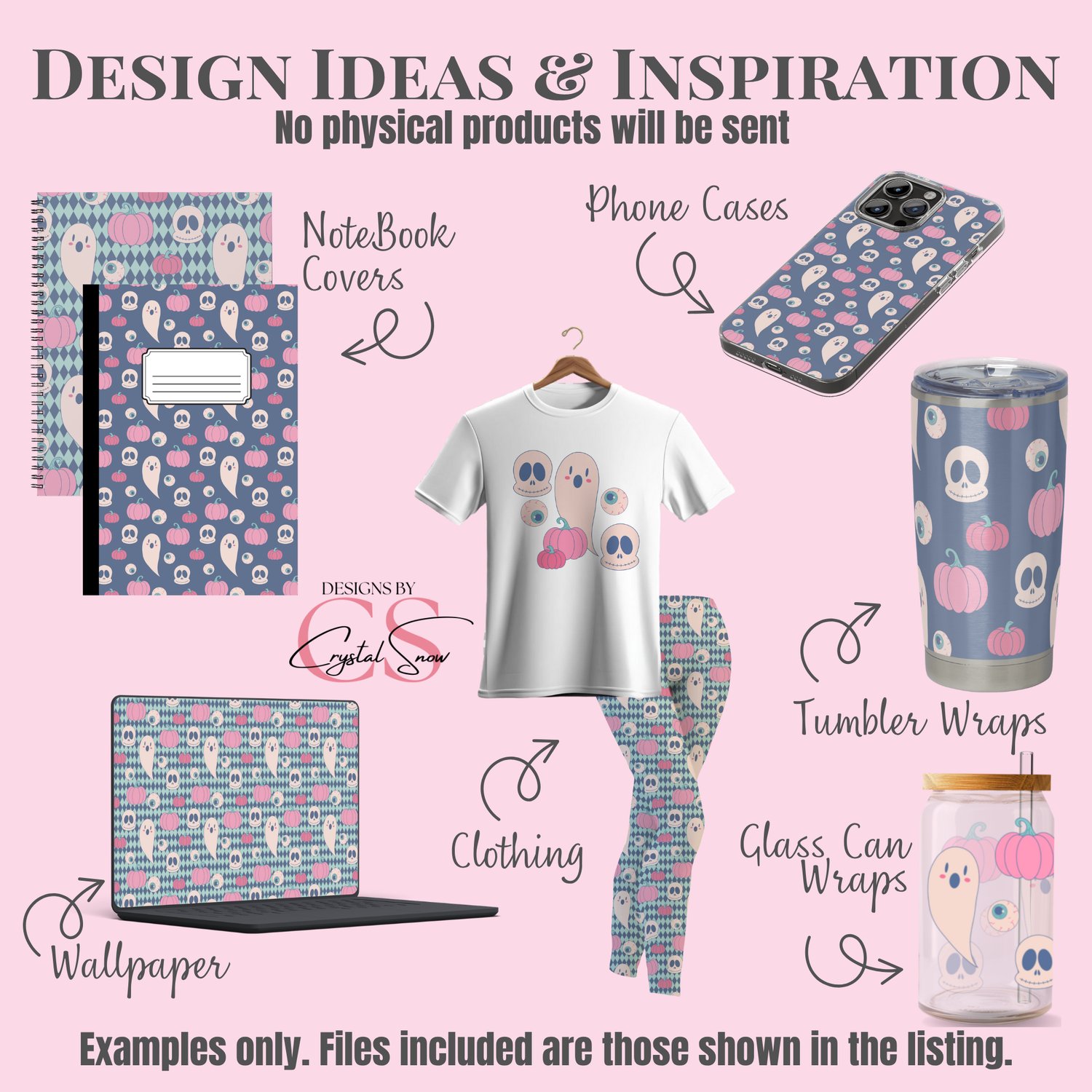 Hand-drawn by Designs by Crystal Snow, this design features pastel ghosts, playful pumpkins, sweet skulls, and quirky eyeballs — available in two background color variations (midnight blue & pastel argyle).