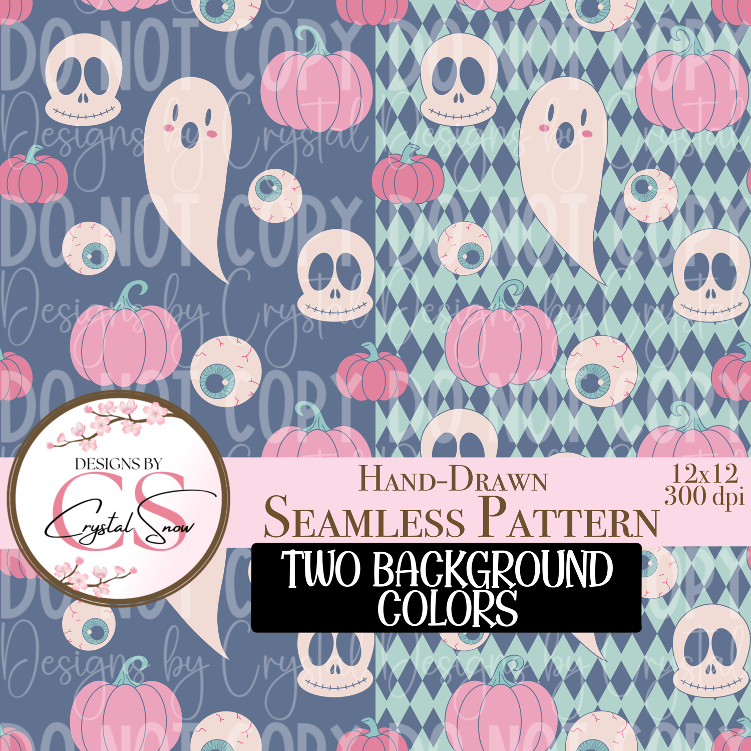 Pastel Halloween Seamless Pattern – Cute Ghosts, Eyeballs, Pumpkins & Skulls – Two Background Colors – Digital Download