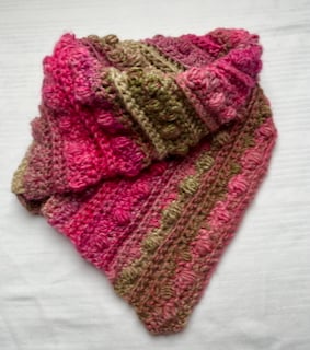 The cowl is crocheted in rows, not in the round, and the resulting rectangle is seamed along the sides in a non-traditional, contoured, and sculptural way. This unique construction is not a classic "tunnel" but, thanks to its interesting shaping and texture, it can be worn in multiple ways, making it not only a beautiful colorful accessory but also a versatile and warm companion. Due to the simple pattern repeat and clearly defined rows, this pattern is suitable even for beginners!
