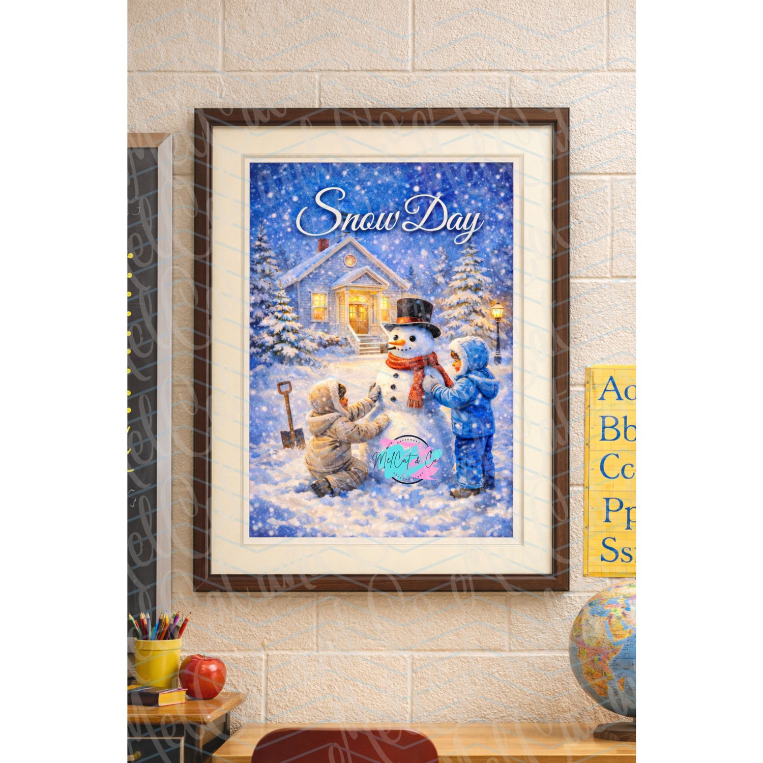 “Snow Day” features two bundled-up children joyfully building a snowman in front of a glowing schoolhouse as gentle snowflakes fall all around. With rich blues, warm golden light, and a nostalgic winter feel, this artwork adds charm and comfort to any learning space.