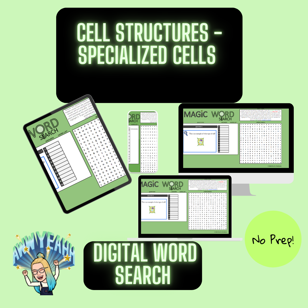 How It Works: In this self-checking activity, students collect one word from the word bank each time they correctly answer a question. Each question is accompanied by a relevant image to aid visual learners in understanding cell structures and specialized cells. As students answer correctly, the letters in the word search puzzle dance around until the final question is completed, rewarding them with a fun word search puzzle for a mini brain-break. ππ§©