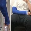 A young and handsome guy with a LAC splint on his right arm covered with a blue bandage arrived at radiology department with his girlfriend. He takes a seat in the waiting area. There you can watch his casted arm for several minutes. He moves in his seat finding a comfortable position. After his name is called to enter the treatment room, he had an x-ray and a cast change to a shorter SAC splint. You can see the SAC for a few seconds when he comes out of the hospital.