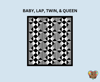 *Note: This pattern includes instructions for a baby (36.25" X 40"), lap (60.75" X 67"), twin (81" X 89.5"), queen (90" X 99.5"), and king (110.25" X 110.25") size quilt.* Blocks are traditional pieced blocks.