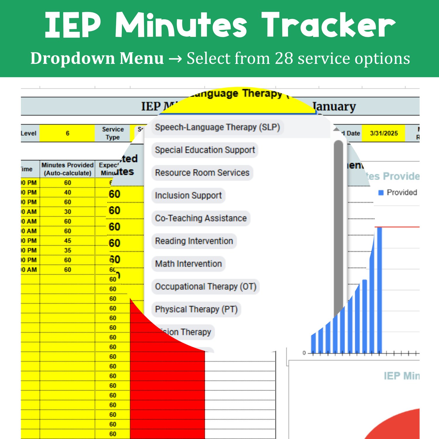 ✔ Dropdown Menu with 28 Service Types – Quickly select the appropriate IEP service.