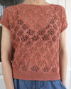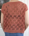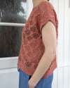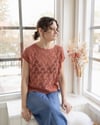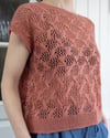 The Daring tee is centered around eyelet lace and cables. It is a casual summer tee knit, designed for light fingering weight summer yarn. The design features a relatively simple, repetitive eyelet lace and cable pattern, as well as a slightly dropped shoulder line.