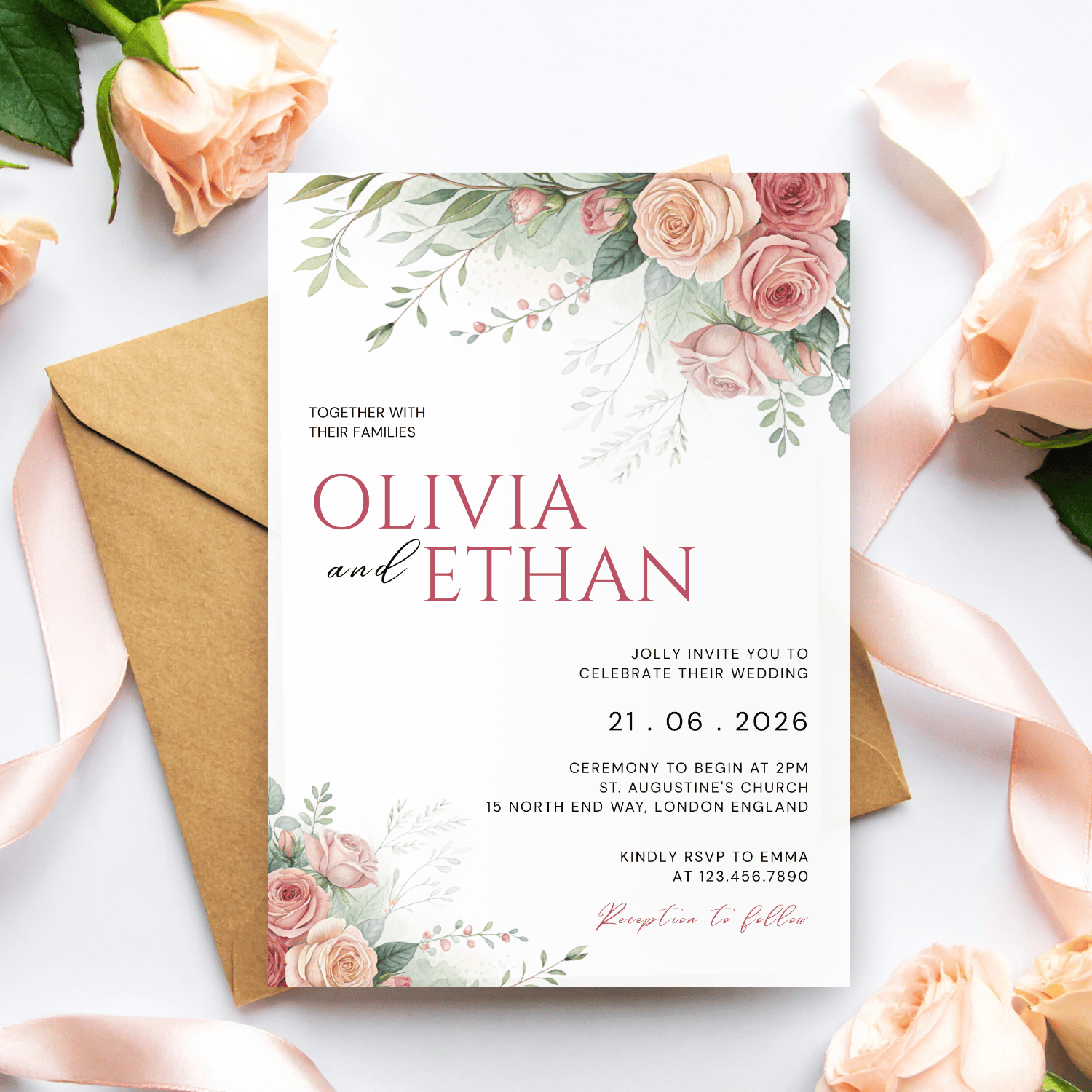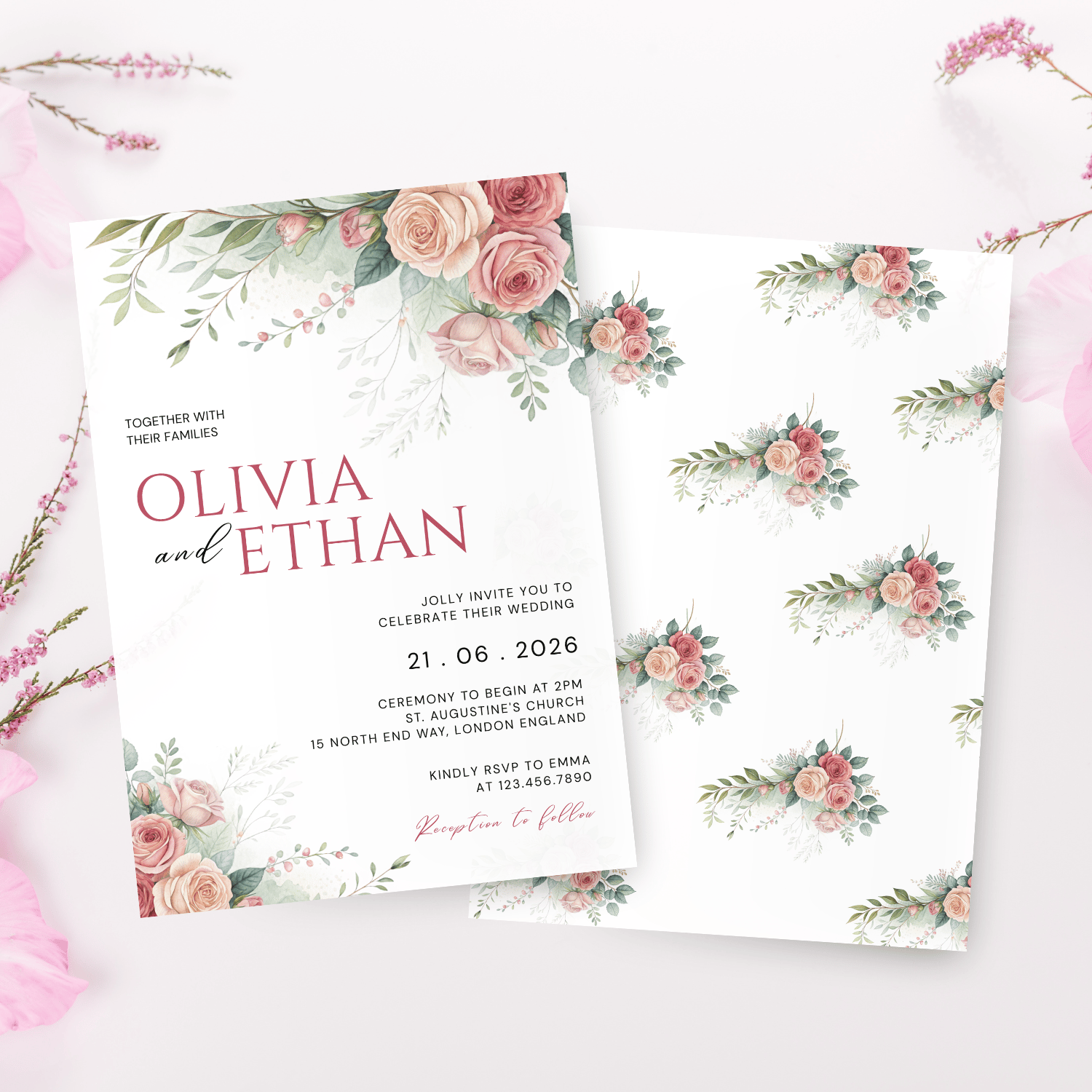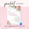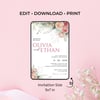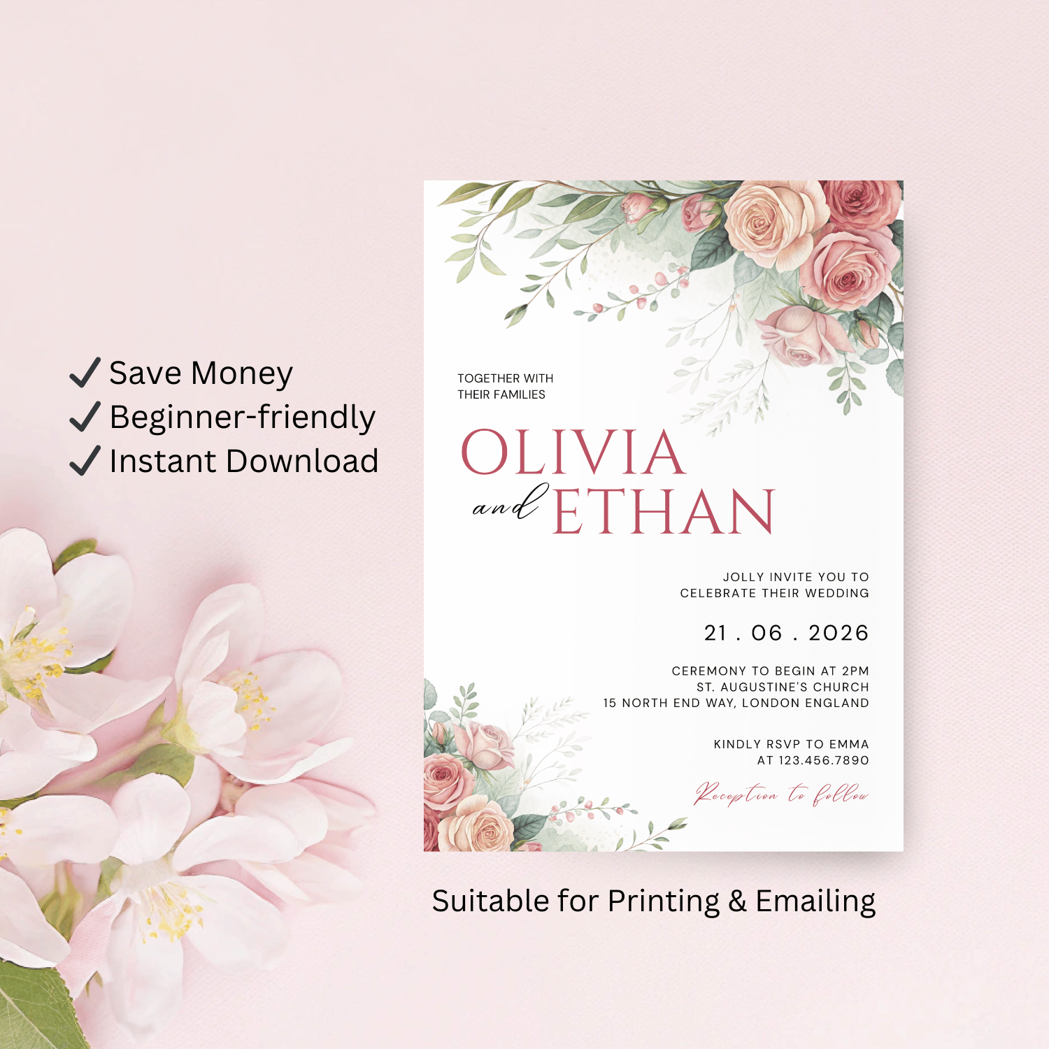 W009 Editable Blush Rose Floral Wedding Invitation Template | Canva Wedding Invite | Instant Download