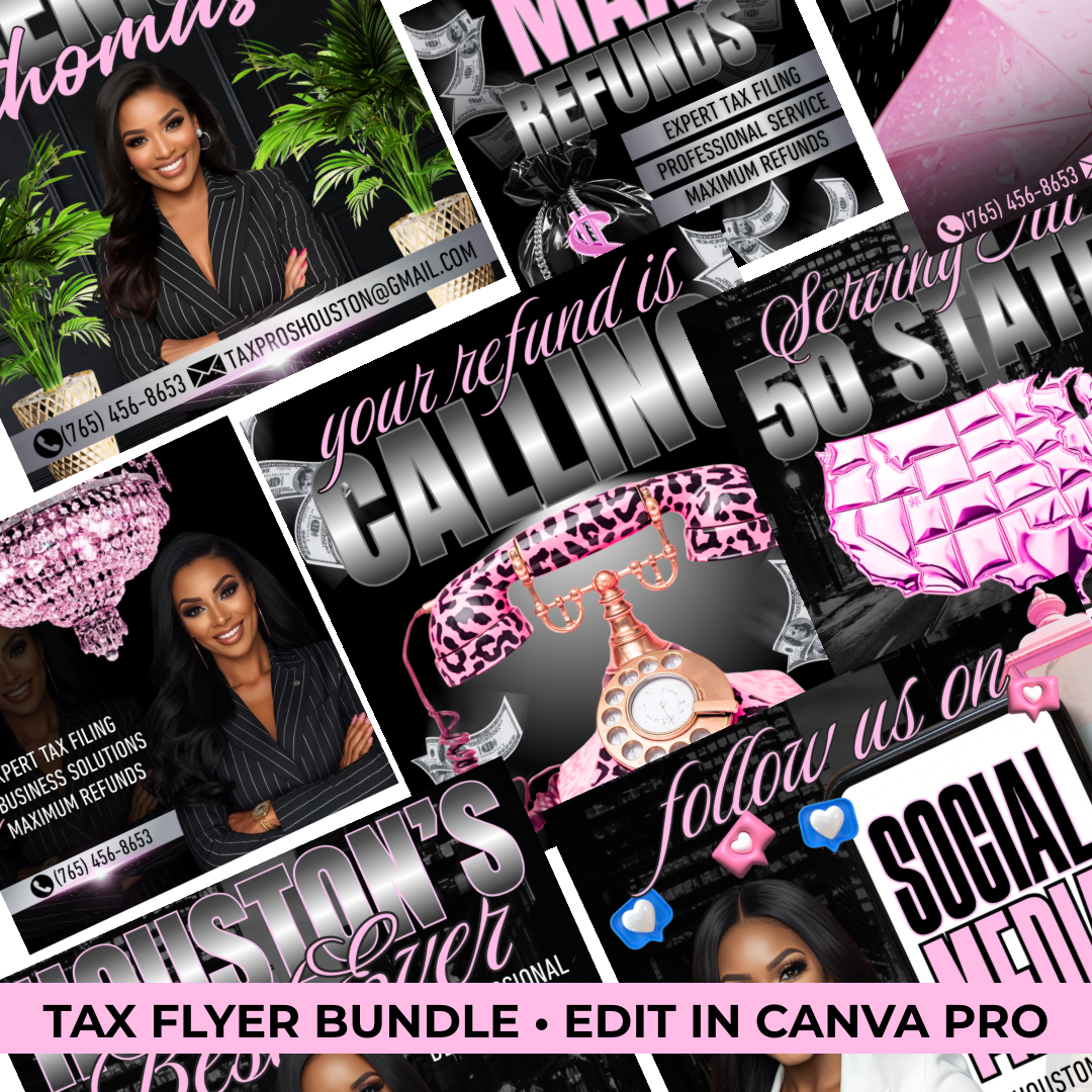 Promote your tax preparation and accounting services with this professional set of 8 Canva flyer templates, designed specifically for tax professionals, CPAs, and small accounting businesses. Each flyer is polished, eye-catching, and perfect for social media marketing, helping you attract new clients and communicate your services clearly.