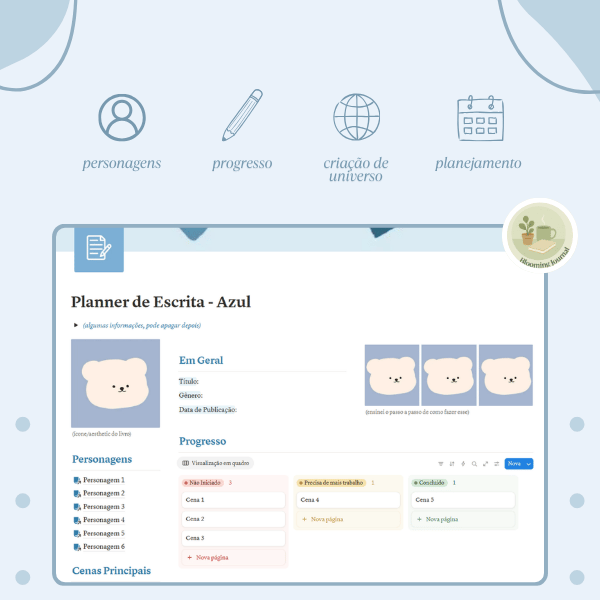 Ideias, personagens e progresso de escrita reunidos em um único espaço no Notion, facilitando acompanhar o desenvolvimento do seu projeto ao longo do tempo!