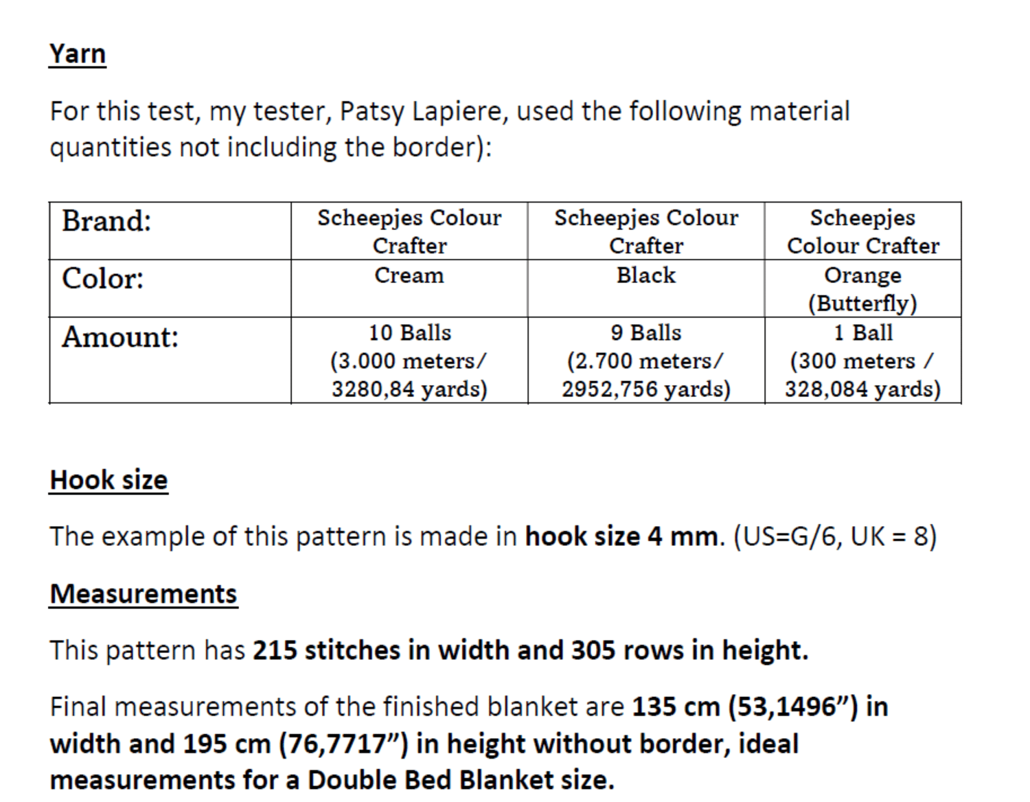 For this pattern, my tester Patsy Lapiere used a 4 mm hook (US=G/6, UK = 8) and the measurements with the recommended yarn (Scheepjes Colour Crafter) were 135 cm (53,1496”) in width and 195 cm (76,7717”) in height without border, ideal measurements for a Double Bed Blanket size.