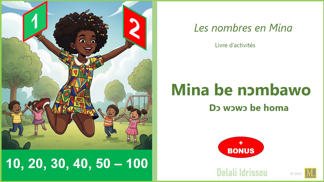 Le livre dépasse le concept de compter des chiffres; il enseigne aussi le noms des animaux domestiques et sauvages en plus du nom de leur femelle et petits. Et ce n'est pas tout, il y a un bonus qui permet de compter au-delà de 100. Cependant, la partie la plus excitante du livre ceux sont ses différentes taches permettant a l'apprenant d'apprendre les chiffres et les nombres aisément en mina.