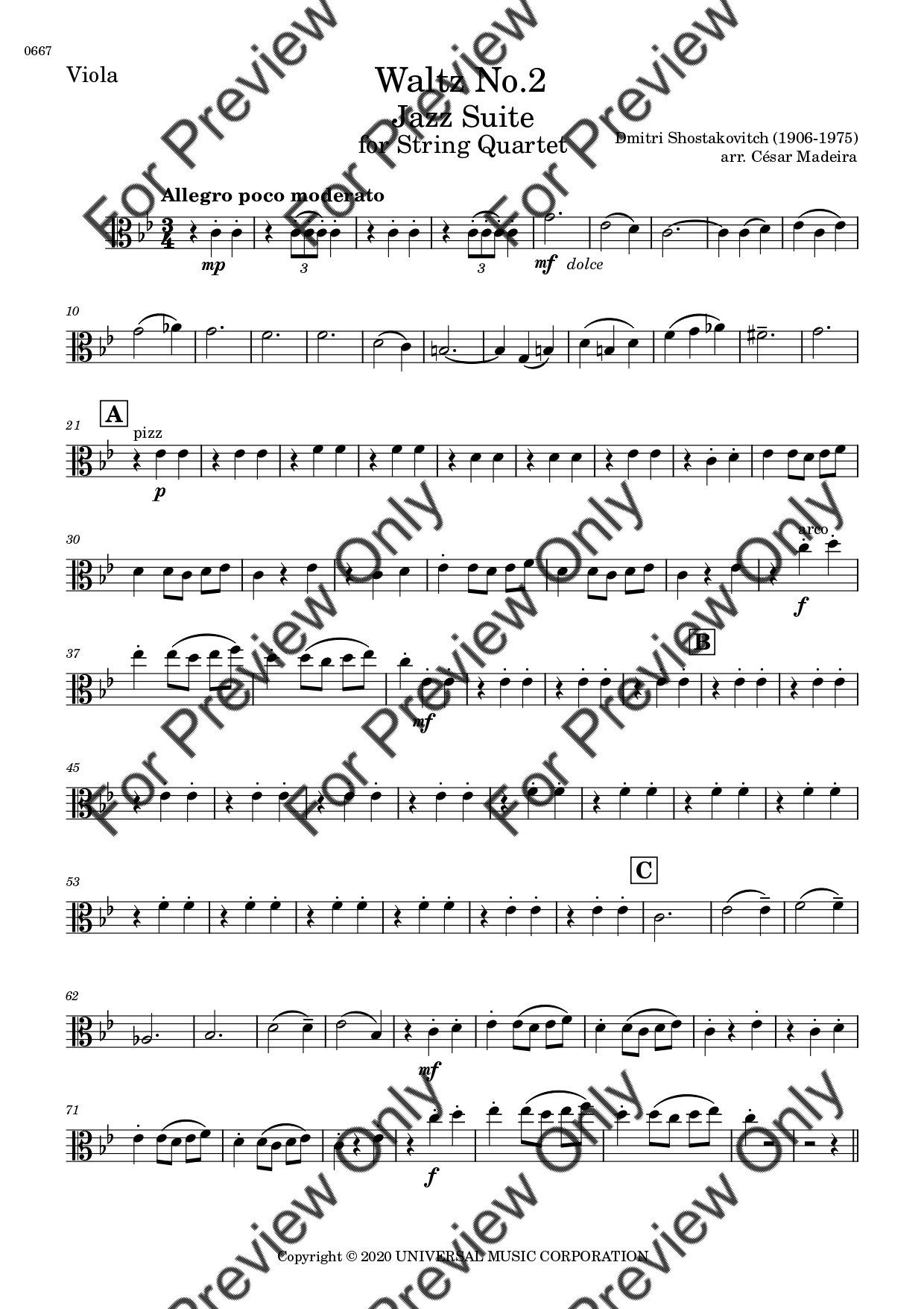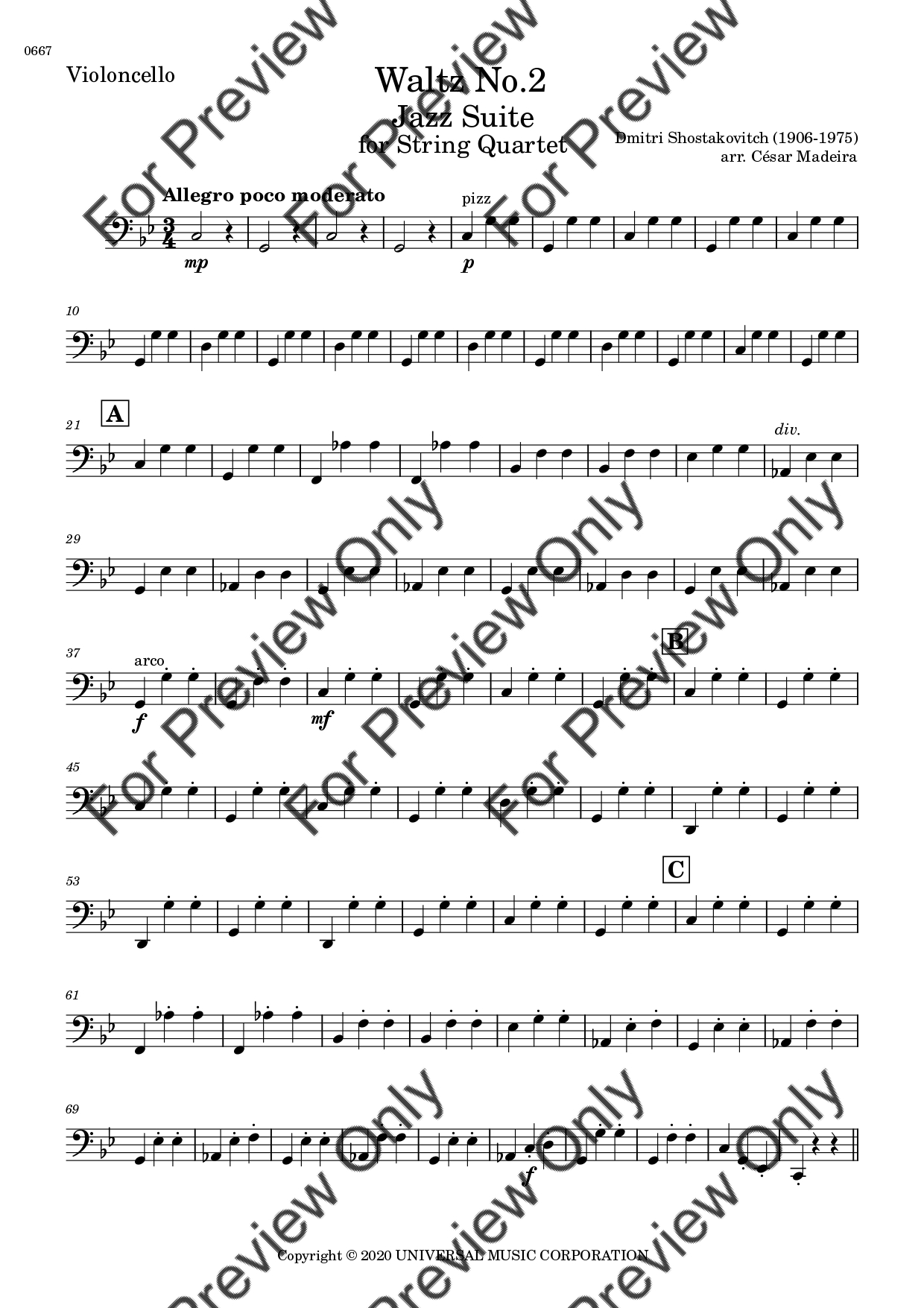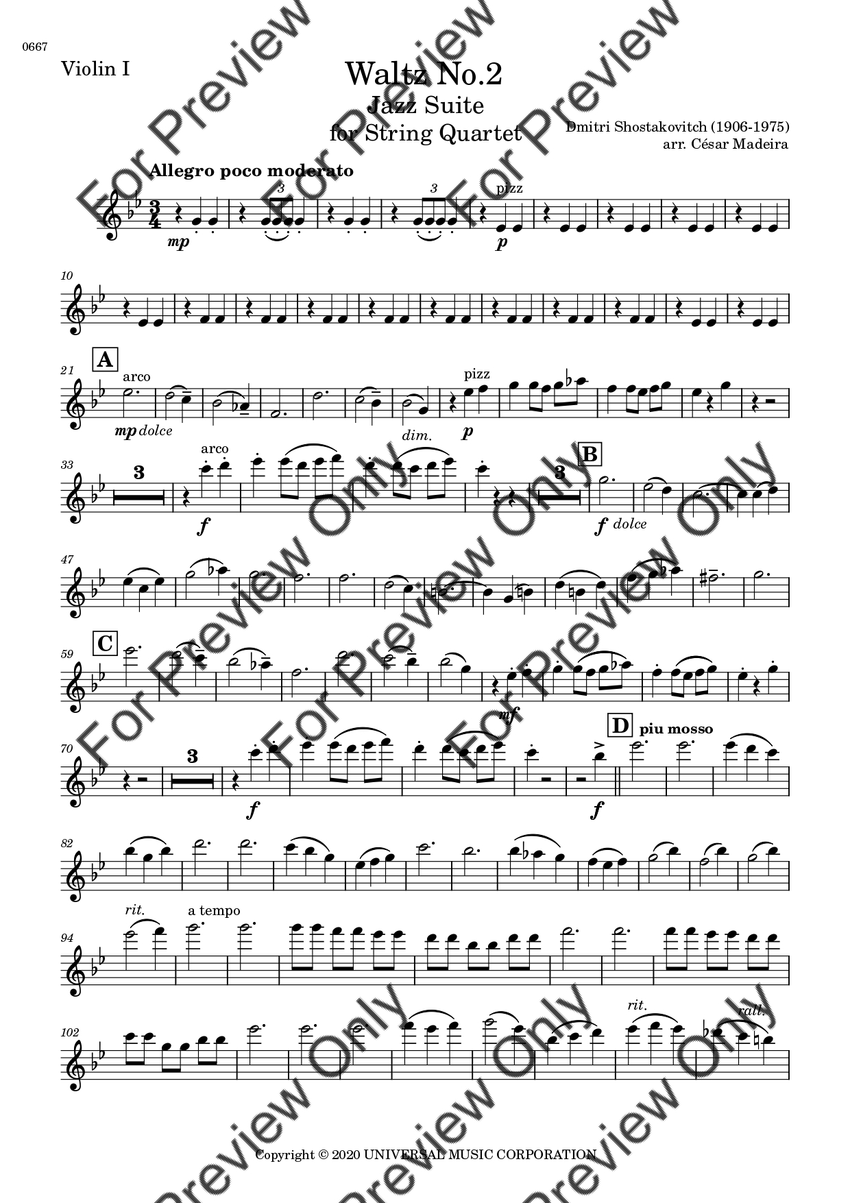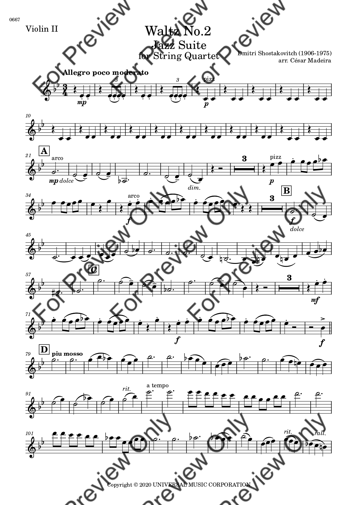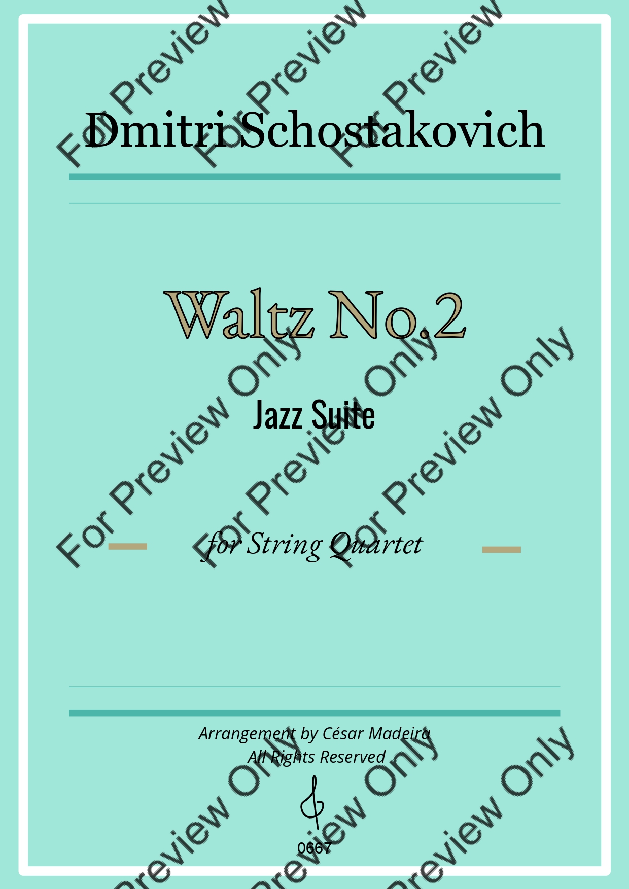 Waltz No.2 by Dmitri Schostakovitch. Arrangement for String Quartet - Violin 1, 2, Viola and Violoncello. With Full Score and Individuall Parts. Have fun!