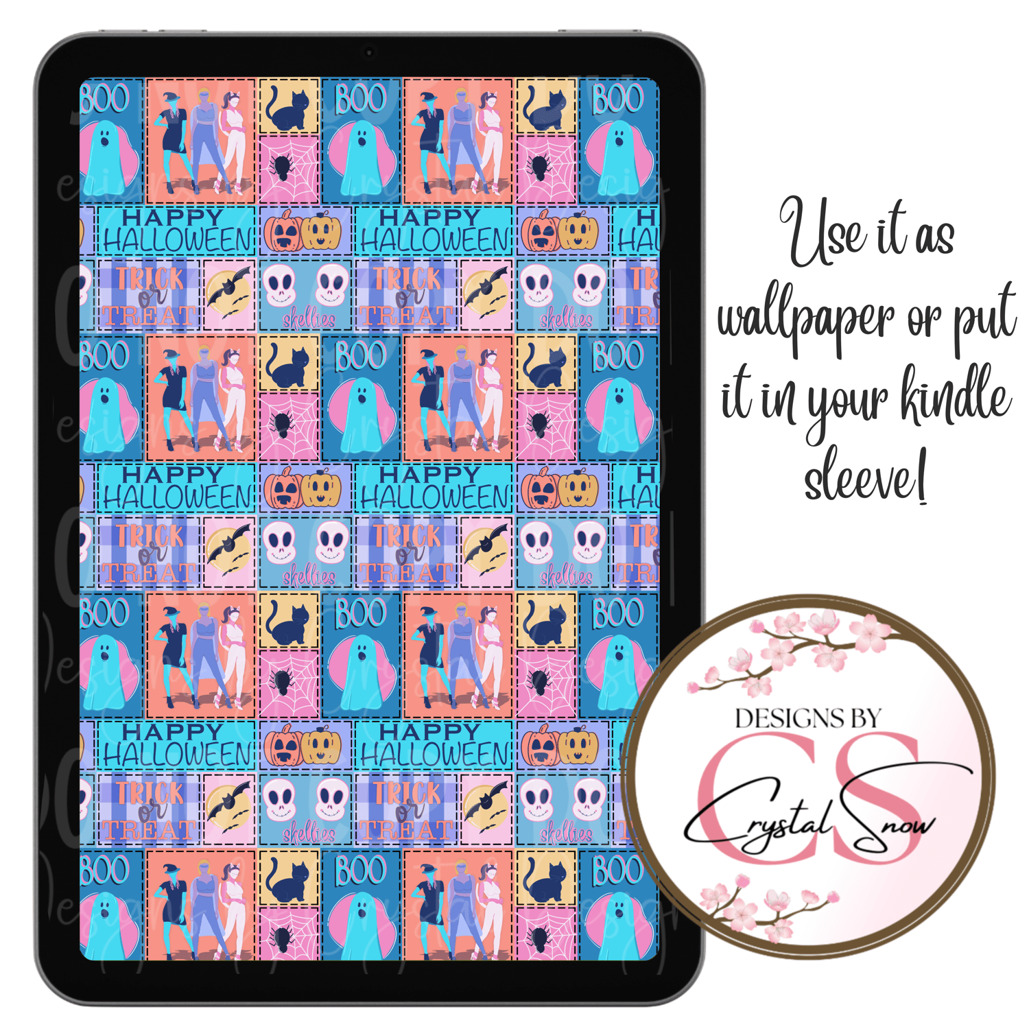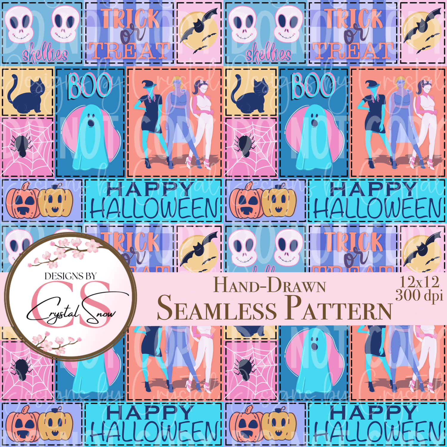 This hand-drawn seamless design brings Halloween fun with a spooky-cute twist! Featuring ghosts, pumpkins, black cats, candy, and witches in a colorful pastel patchwork style, this high-resolution pattern is ideal for all your creative needs. Use it for sublimation on tumblers, scrapbooking, planner stickers, party decor, or even custom fabric printing.