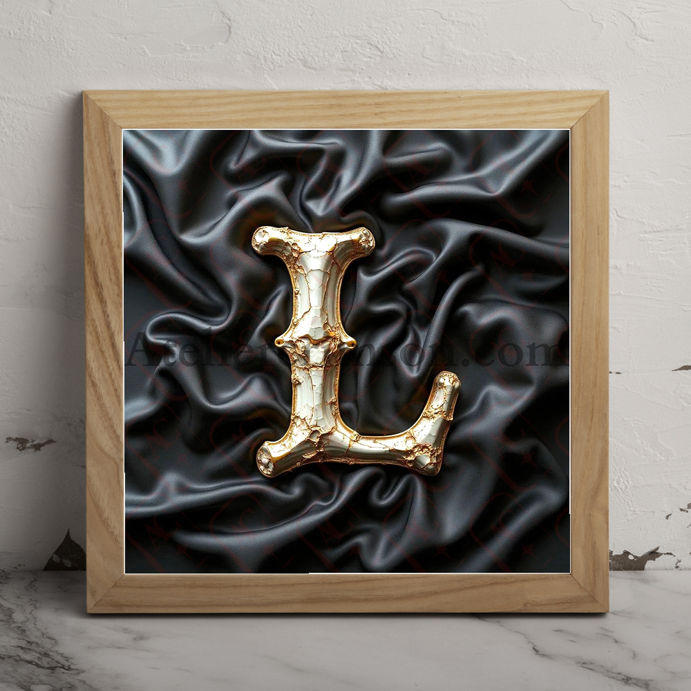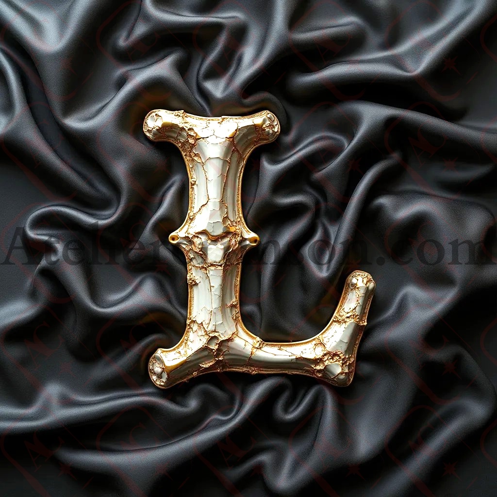 The letter L Bones with gold fissures A hauntingly beautiful character crafted from pristine human femur bones, intricately arranged to form a bold, serif typeface. Delicate golden fissures, reminiscent of kintsugi art, weave through the ivory-white osseous structure, adding an element of elegant repair. The character stands proudly on a luxurious marbled floor, its form casting subtle shadows. Behind it, a textured black linen backdrop provides a striking contrast, emphasizing the letter's ethereal beauty.