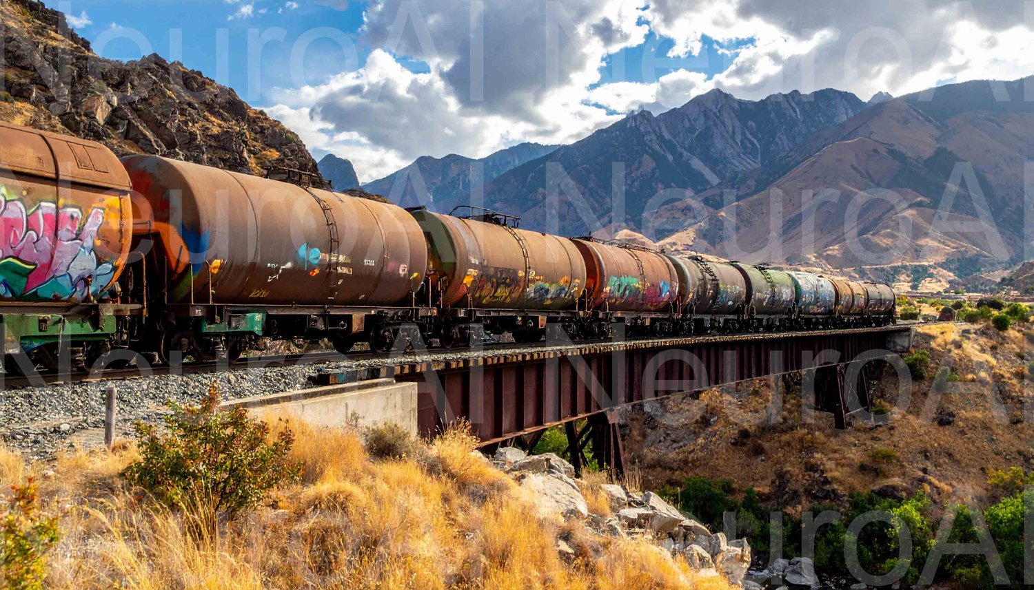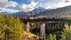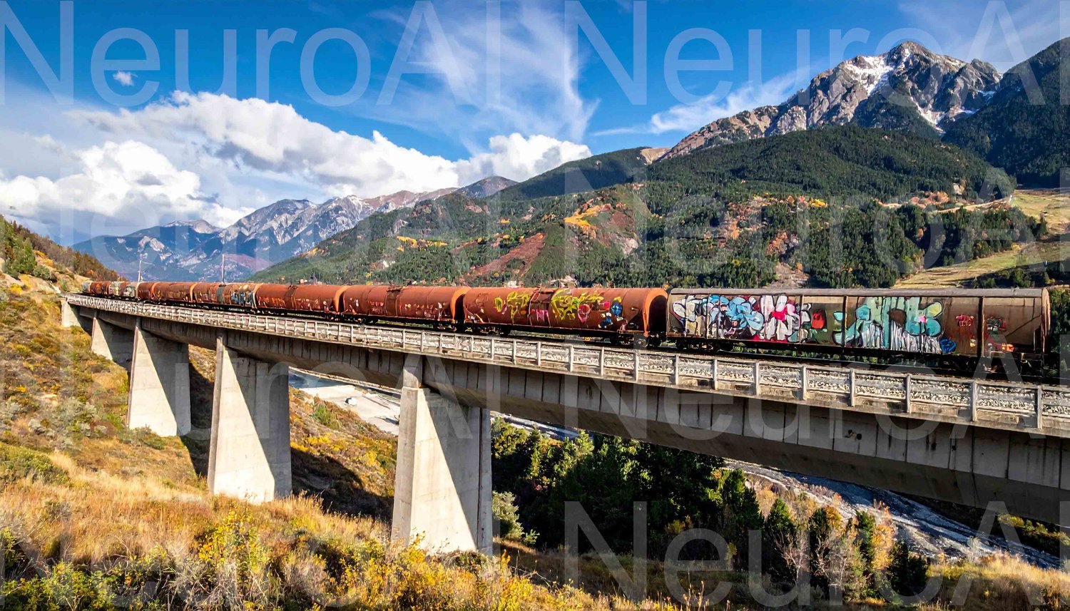 Freight train crossing bridge, amazing mountains view