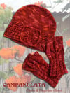 Photos show both cloche and gloves in size M. Yarn used for both is Regia Galaxy Color in colorway 1559 “Jupiter Red.”