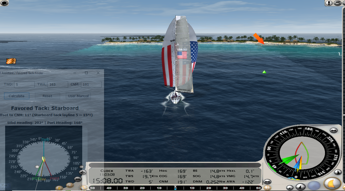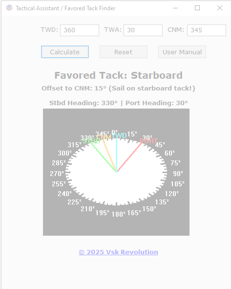 The Tactical Assistant / Favored Tack Finder is a real-time tactical overlay for Virtual Skipper 5 (Vsk5) and Vsk5Online. It shows which tack — Port or Starboard — points you closer to the next mark and how far off the layline you are. Great for training, race prep, and in-race decisions, especially when the next mark may be off-screen.