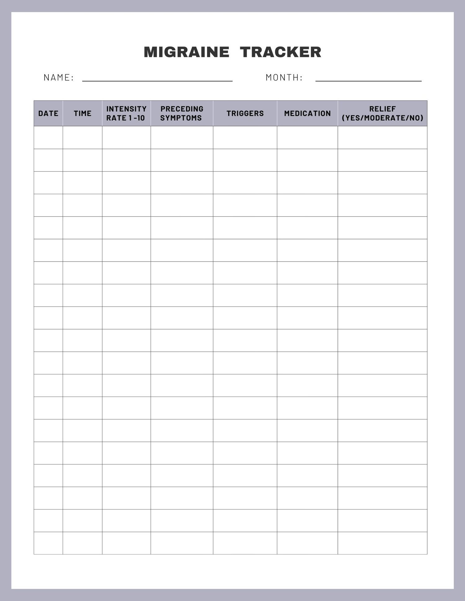 - Space to track date, time, intensity (1–10), symptoms, triggers, medications, and relief level
