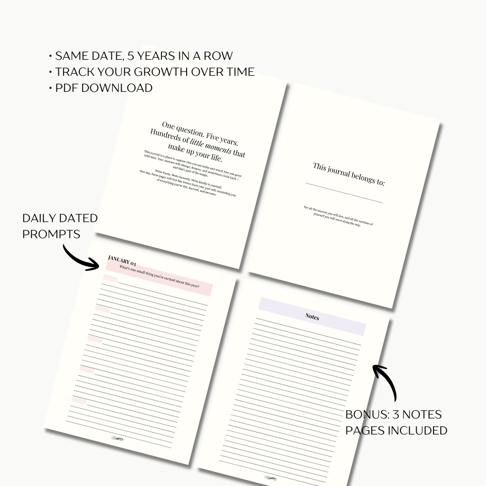 Each day, you’ll answer one thoughtful prompt, revisiting the same date for five consecutive years. Over time, your entries become a meaningful record of how your mindset, priorities, and life experiences evolve.