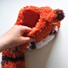 Bulky weight 5 faux fur yarn in red, brown, and white (I used Hobbii Peacock yarn: 2 skeins red, 1 skein brown, 1 skein white)