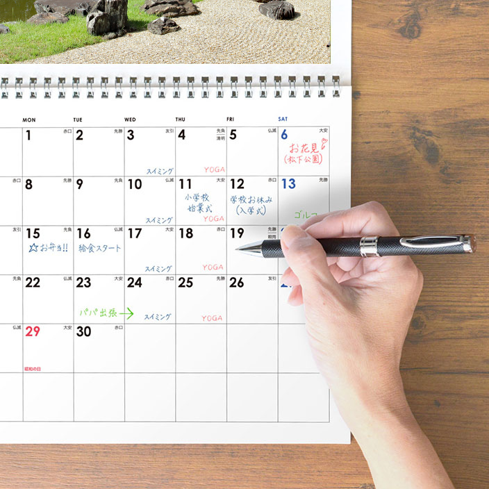 There is a white border around the photos of the gardens and defined fields for writing down appointments.