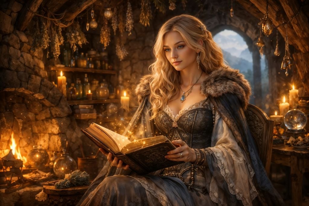 Candlelight. Whispering herbs. A firelit room where old stone keeps secrets—and an open book releases golden magic into the air. “The Hearthspell Grimoire” is a luxurious 10K fantasy artwork that blends cozy enchantment with refined elegance: intricate fabrics, warm ember glow, hanging bundles of dried botanicals, and a serene spellcaster caught in a moment of wonder.