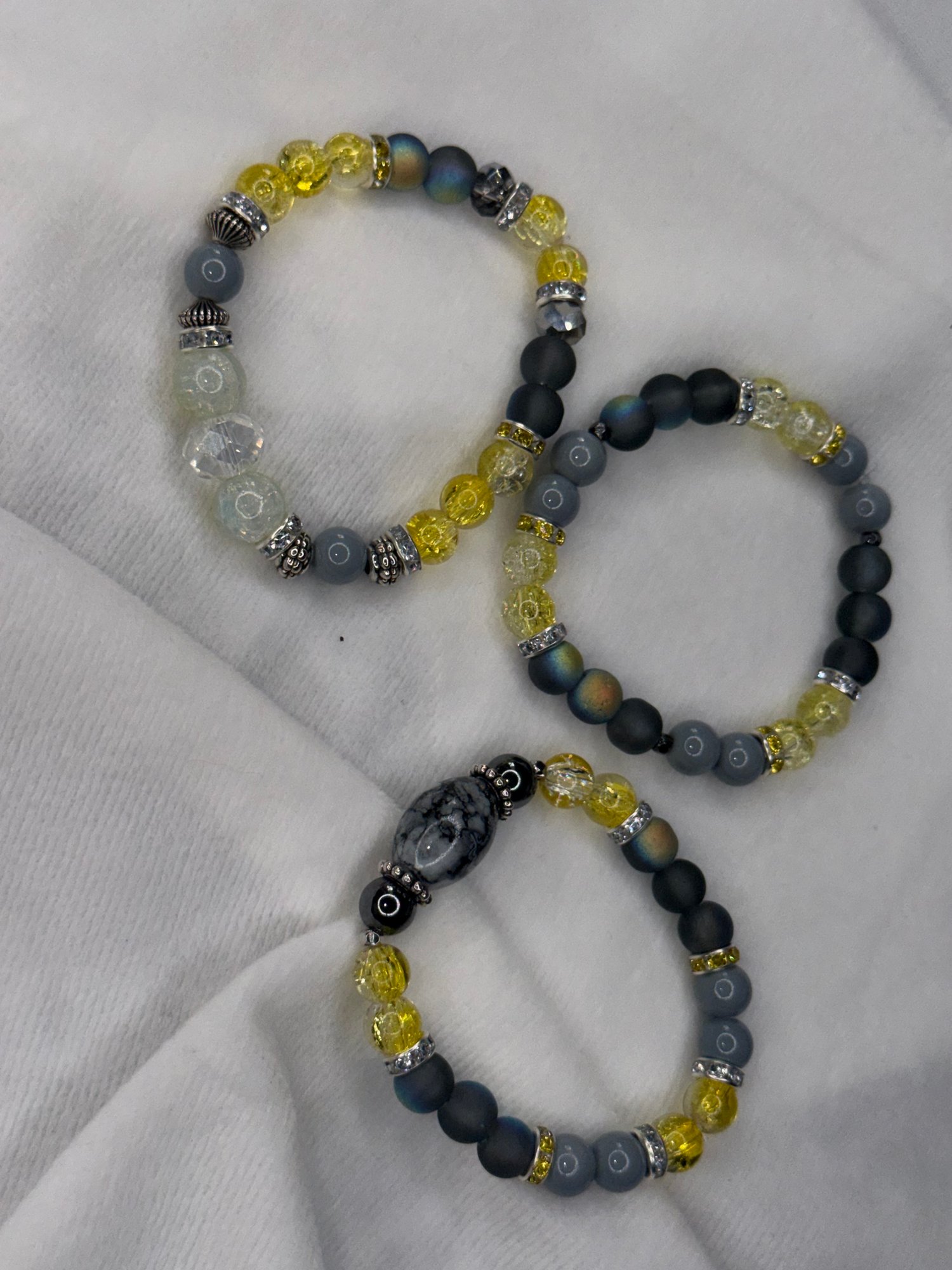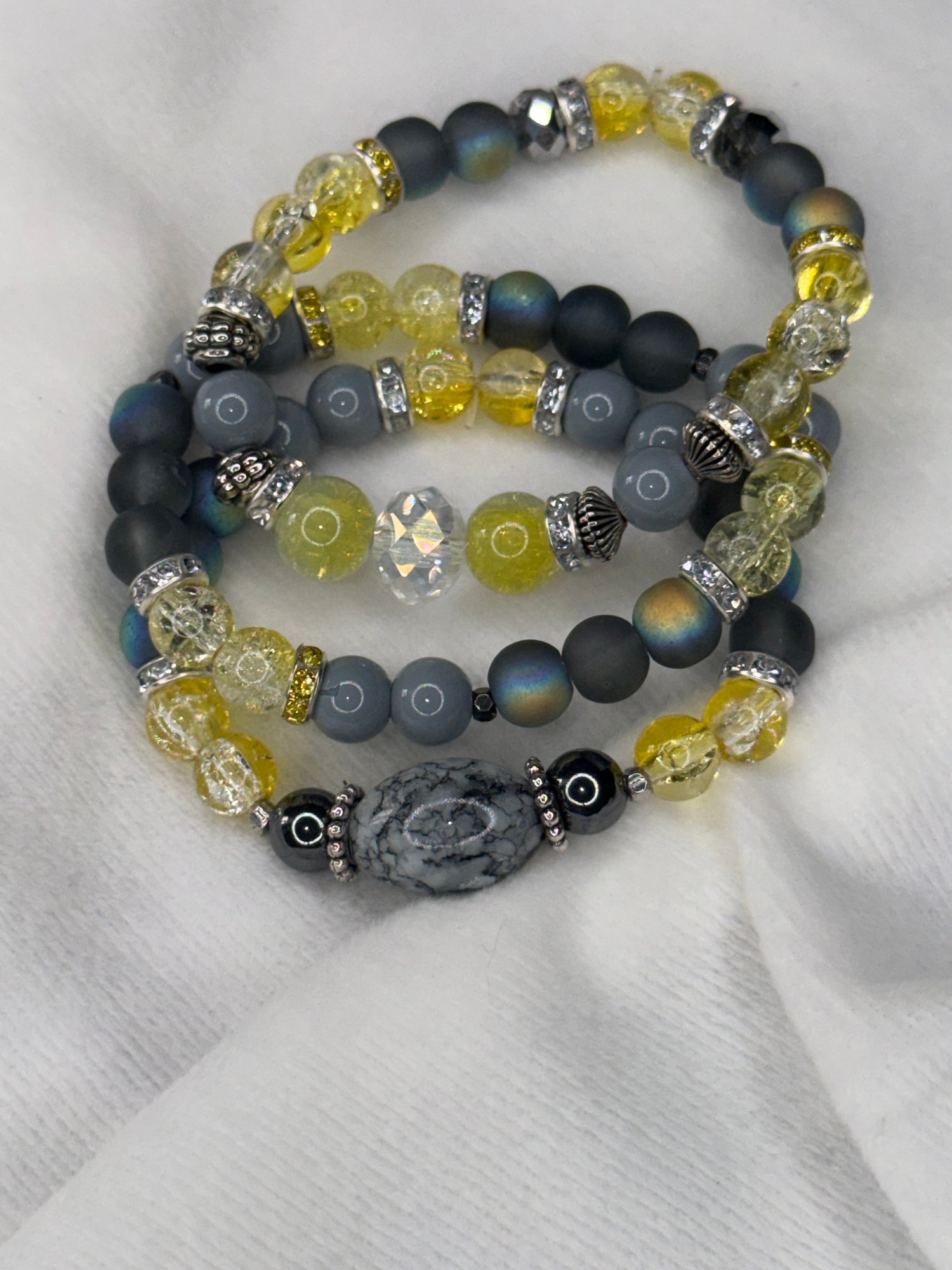 We’ve mixed matte grey and charcoal beads (resembling storm clouds) with vibrant yellow cracked glass that pops like lightning. Anchored by a large marbled grey gemstone focal bead, this stack is pure industrial glam.