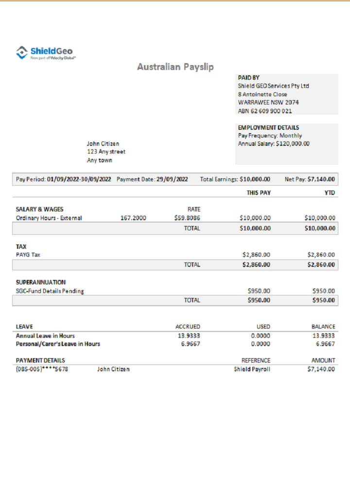 Australia Shield Geo consulting company pay stub Word and PDF template