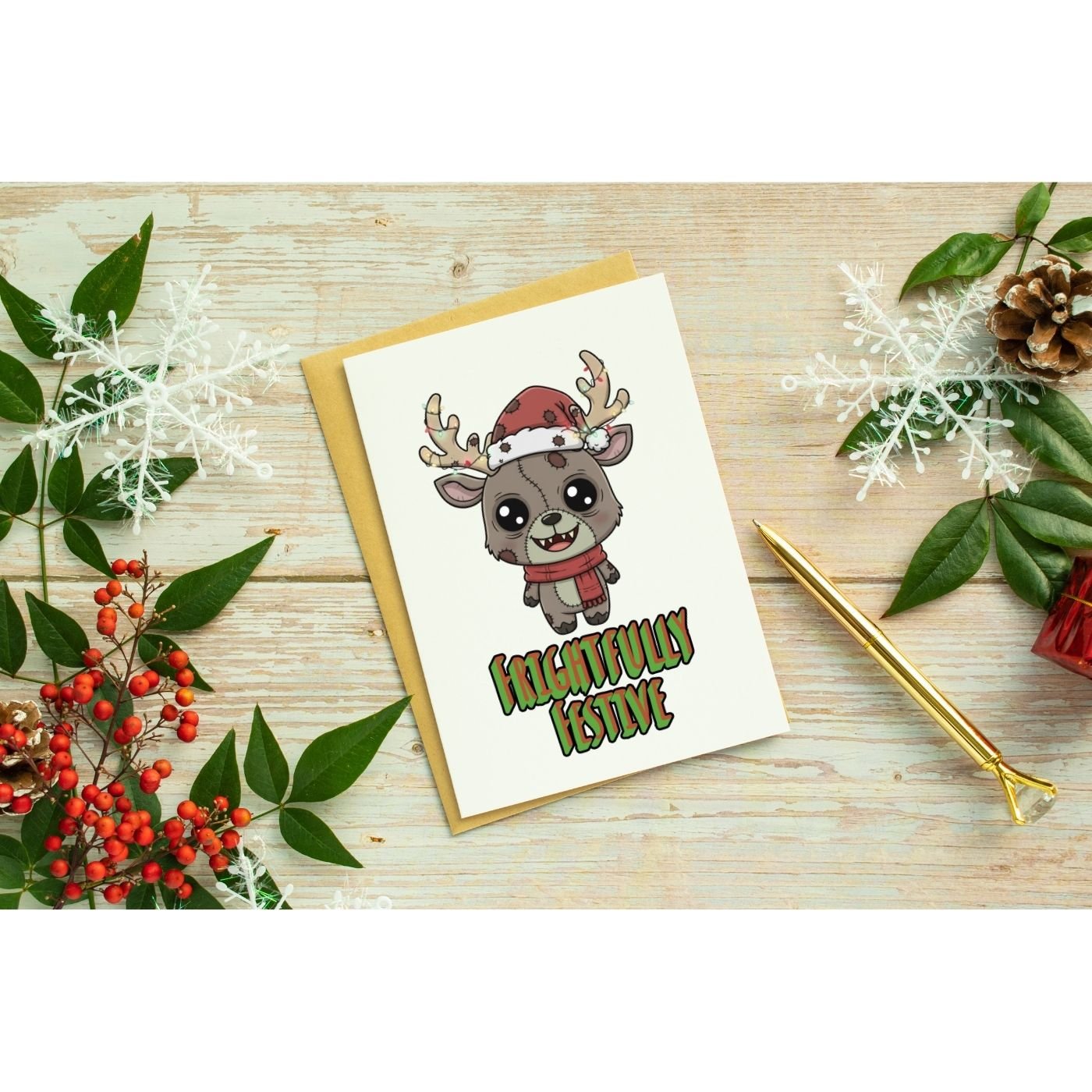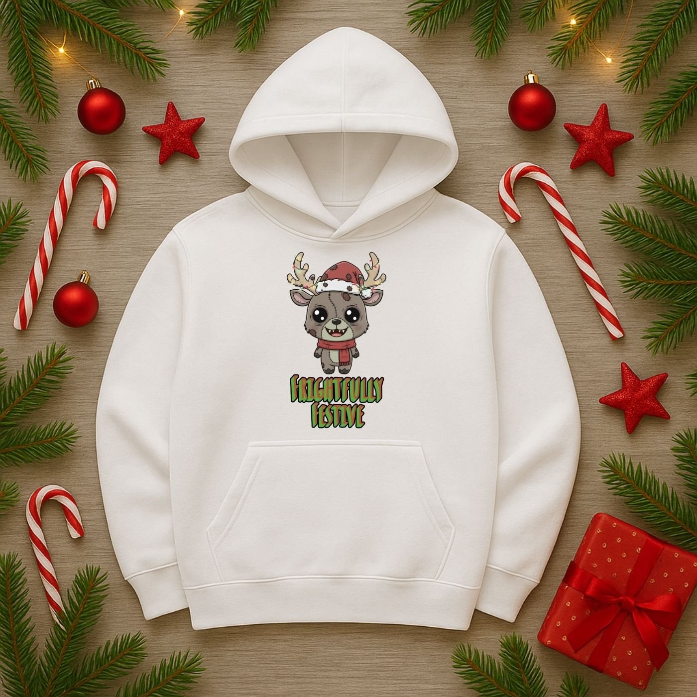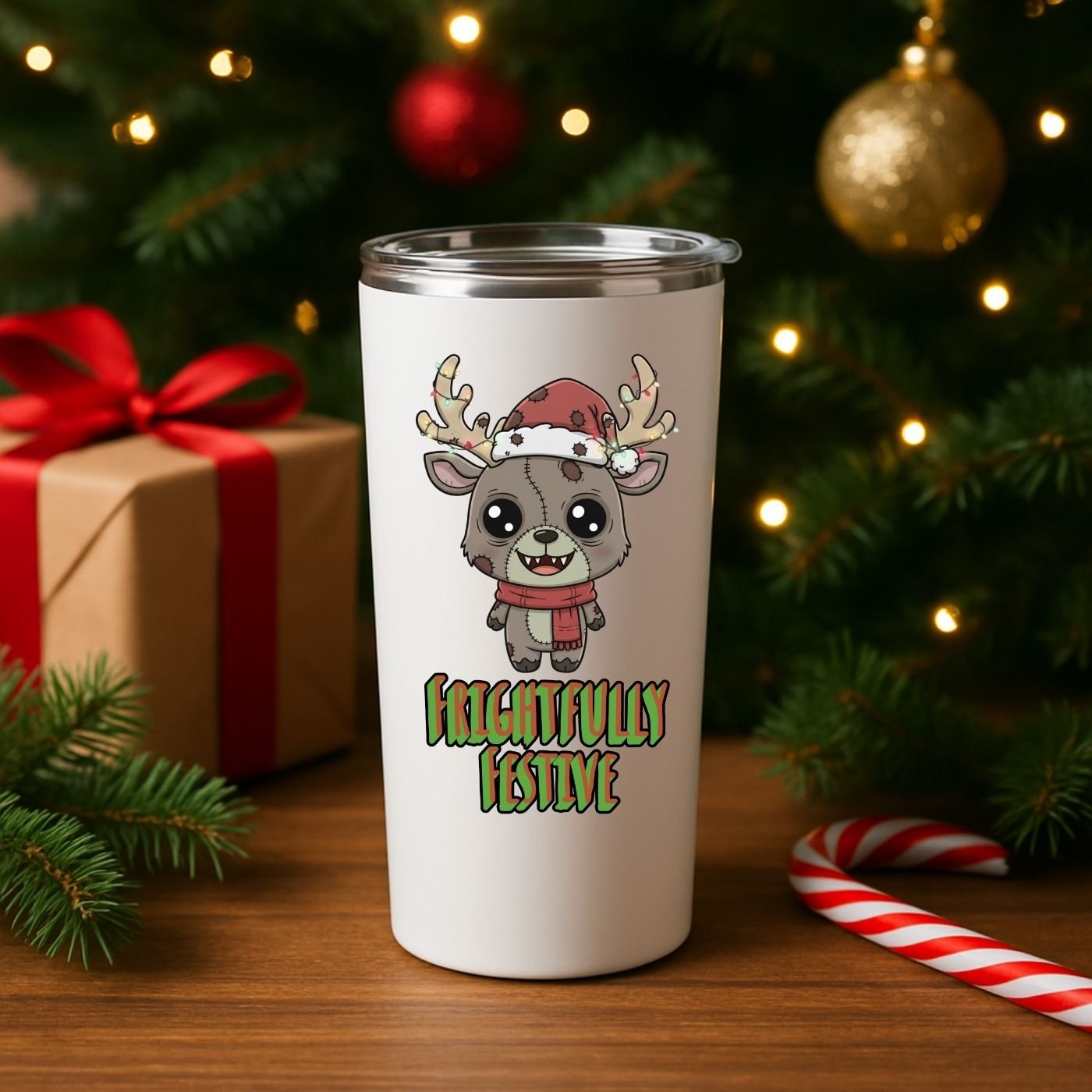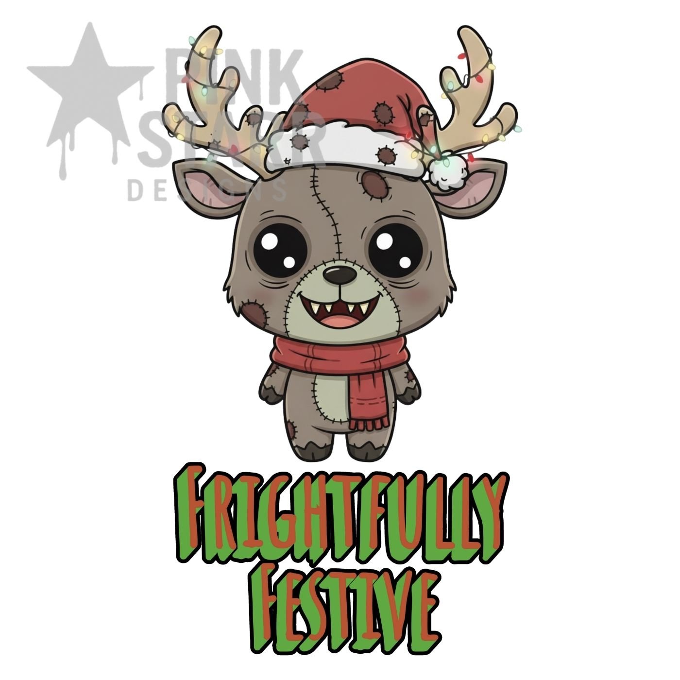 Bring spooky holiday charm to your shop with this Frightfully Festive Zombie Reindeer PNG. This creepy-cute Christmas design features a chibi zombie reindeer wearing a Santa hat and scarf, stitched details, and glowing Christmas lights wrapped around the antlers. Perfect for sublimation projects and holiday merch with a fun, gothic twist.