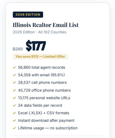 Data compiled from Realtor.com, Homes.com, RE/MAX, and state association directories — merged, cleaned, and deduplicated. With 54,358 records including an email address (95.6% coverage), this is among the most complete IL realtor databases available.