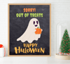 No more candy? Tell the trick or treaters with this cute printable sign! Great to print out and let everyone know "Sorry, Out Of Treats" so your doorbell doesn't ring all night and your front door doesn't get any more knocks from little monsters! It can be hung up on the front door or framed and set next to the empty candy bowl. Background is a chalkboard pattern and graphics feature an adorable kawaii ghost holding a pumpkin.
